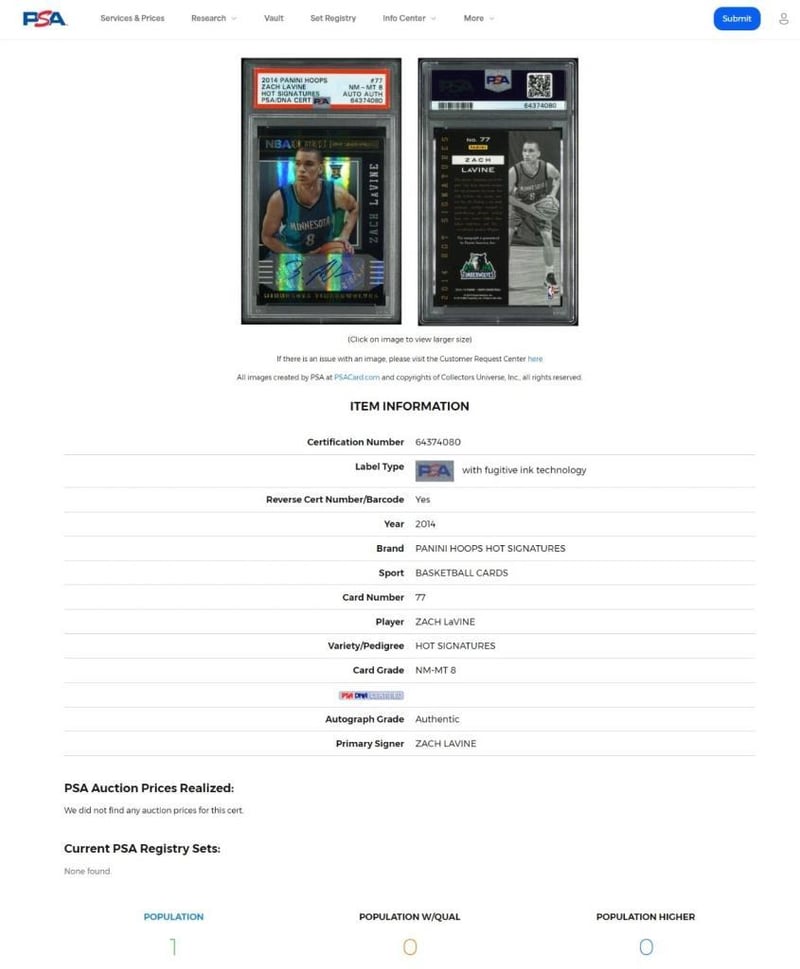2014-15 PANINI HOOPS HOT SIGNATURES #77 ZACH LAVINE SIGNED ROOKIE CARD – PSA NM-MT 8, PSA/DNA AUTHENTIC – POP 1A Rare Autographed Rookie-Era Issue Of The Two-Time Nba Slam Dunk Champion – Psa Certified And Encapsulated - Nba BasketballOverview:Offered Is A 2014–15 Panini Hoops Hot Signatures #77 Zach Lavine Rookie Card, Graded Psa 8 (Near Mint-Mint), With The Autograph Authenticated By Psa/Dna. As One Of The Earliest Signed Cards Issued During Lavine’S Rookie Season, This Hot Signatures Insert Delivers Both Aesthetic Appeal And Long-Term Collectability. With Its Confirmed Population 1 Status, This Encapsulated Card Stands Alone In The Psa Registry Under Its Precise Configuration, Underscoring Its Rarity Within An Increasingly Competitive Market For Autographed Rookie Issues.Key Features:The Card Features Lavine In His Minnesota Timberwolves Uniform, Pictured In Dynamic Action With A Bold On-Card Autograph Signed In Blue Ink Across The Lower Portion. The “Hot Signatures” Subset Is Well-Regarded For Its Clean Layout, Energetic Design, And Focus On Emerging Nba Talent. This Particular Example Has Been Professionally Graded Psa 8, Reflecting Overall Strong Condition With Only Minor Wear Consistent With The Assigned Grade. The Autograph Has Been Fully Authenticated And Encapsulated By Psa/Dna, With No Qualifiers, Ensuring Confidence In Its Legitimacy And Presentation.Why This Card Is Collectable:Zach Lavine’S Career Trajectory From Highlight-Reel Dunker To Two-Time Nba All-Star And Prolific Scorer Has Significantly Elevated The Status Of His Early Issues. Autographed Rookie Cards Remain A Cornerstone Of The Modern Basketball Card Market, And The Panini Hoops Line Is Recognised For Both Accessibility And Design Integrity. With Psa/Dna Certification Of The Signature And A Confirmed Pop 1 Status, This Card Represents An Outstanding Opportunity For Collectors Seeking Scarcity, Authenticity, And Rookie-Year Relevance In A Single Encapsulated Piece.Collector Appeal:This Card Is Ideally Suited To Collectors Focusing On Modern-Era Nba Stars, Authenticated Signatures, Or Rookie-Year Material From High-Ceiling Athletes. It Also Fits Within A Broader Investment Strategy Targeting Lower Population Autographed Cards With Long-Term Upside. Encapsulated By Psa In A Tamper-Evident Case, This Card Offers Both Protection And Prestige, Making It Well-Suited For Long-Term Storage Or Prominent Display.584885+5
