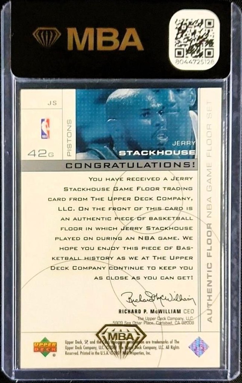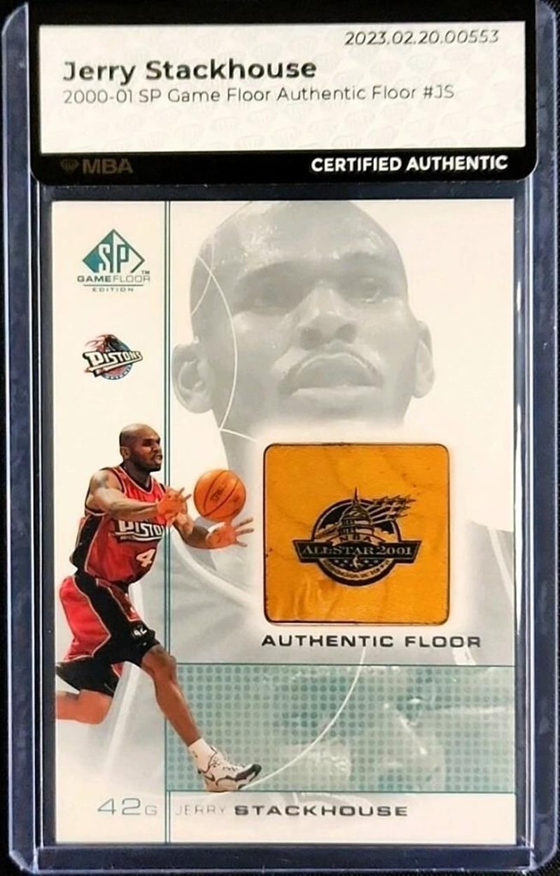 2000 SP GAME FLOOR JERRY STACKHOUSE #JS – GAME-USED FLOOR PATCH – MBA AUTH – CERTIFIED NBA BASKETBALL RELIC2000 Sp Game Floor Jerry Stackhouse #Js Trading Card, Featuring An Authentic Piece Of Nba Game-Used Hardwood Floor, Officially Certified By Upper Deck Under The Mba Auth (Memorabilia Authentication) Label.Card Details:- Player: Jerry Stackhouse (Detroit Pistons)- Card Number: #Js- Series: 2000 Sp Game Floor Basketball (Upper Deck)- Feature: Game-Used Floor Patch- Authentication: Mba Auth – Manufacturer Certified Game-Used Material- Type: Relic / Memorabilia Card- Condition: Certified AuthenticThis Card Contains A Genuine Piece Of Court Flooring Used During An Official Nba Game In Which Jerry Stackhouse Played. Issued As Part Of Upper Deck’S Sp Game Floor Series, It Represents A Key Moment In Hobby History—The Early Era Of Certified Memorabilia Embedded Directly Into Trading Cards. The Die-Cut Window Displays A Piece Of The Floor With Distinct Grain And Texture, Set Against A Clean, Sharp Design. The Reverse Of The Card Includes Upper Deck’S Authentication Statement Confirming The Relic’S Game-Used Origin.Why Collectors Value This Card:- Authenticated Game-Used Nba Memorabilia- Features Jerry Stackhouse, Two-Time All-Star And Key Figure Of The Early 2000S Pistons- Part Of One Of Upper Deck’S Earliest Relic Series- Tangible Link To The Court, Offering Nostalgic And Historical Appeal584885+24