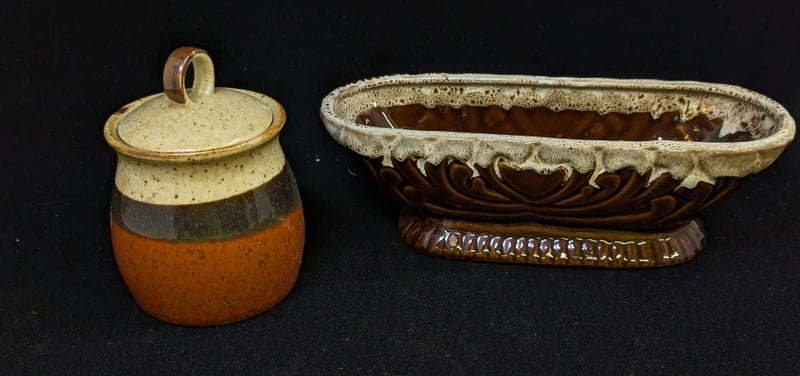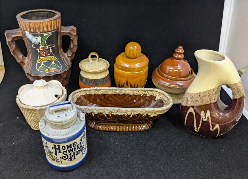 COLLECTION OF DECORATIVE KITCHENWAREIncludes Ceramic Sugar Bowls, Stoneware Pottery, Dark Wood Pitcher, Etc.Condition: Good - Refer To Images584936+9