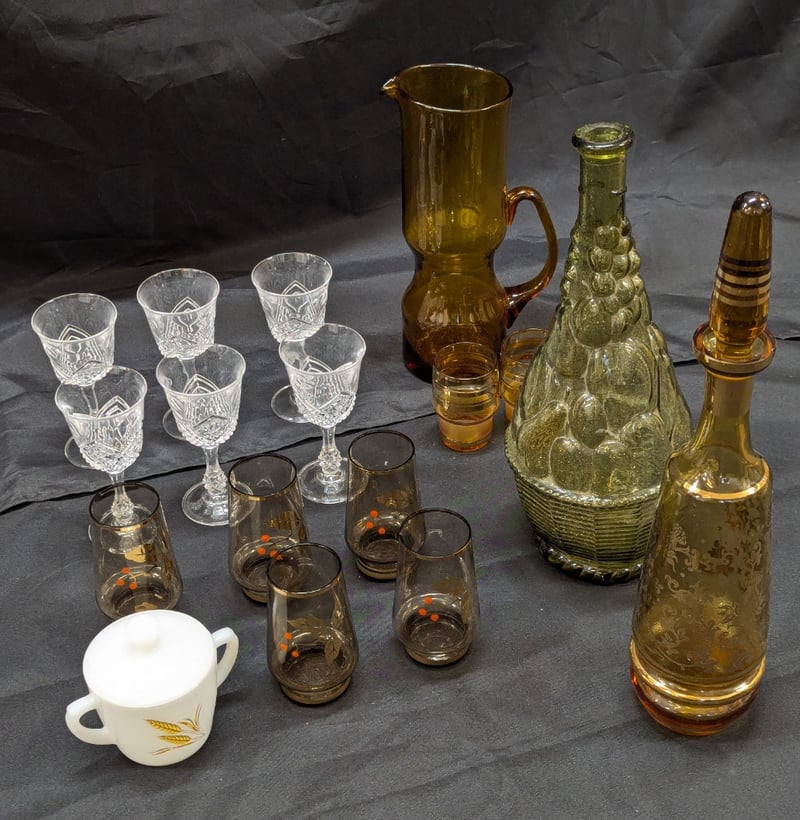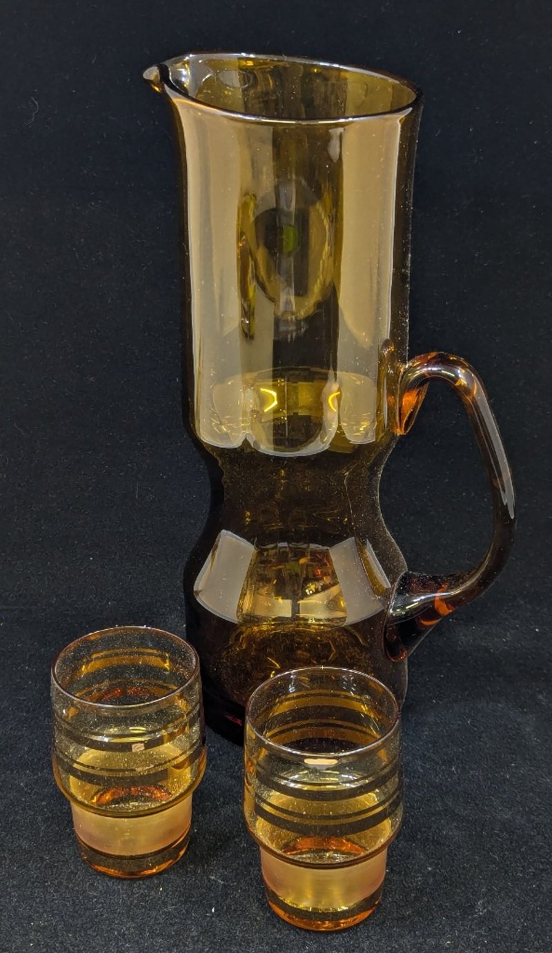 COLLECTION OF GLASSWAREIncludes Cristal D'Arques Glasses, Amber Coloured Pitcher, Amber Coloured Decanter With A Stopper, And GlassesCondition: Good - Refer To Images584936+10