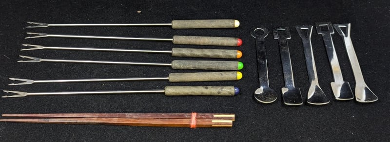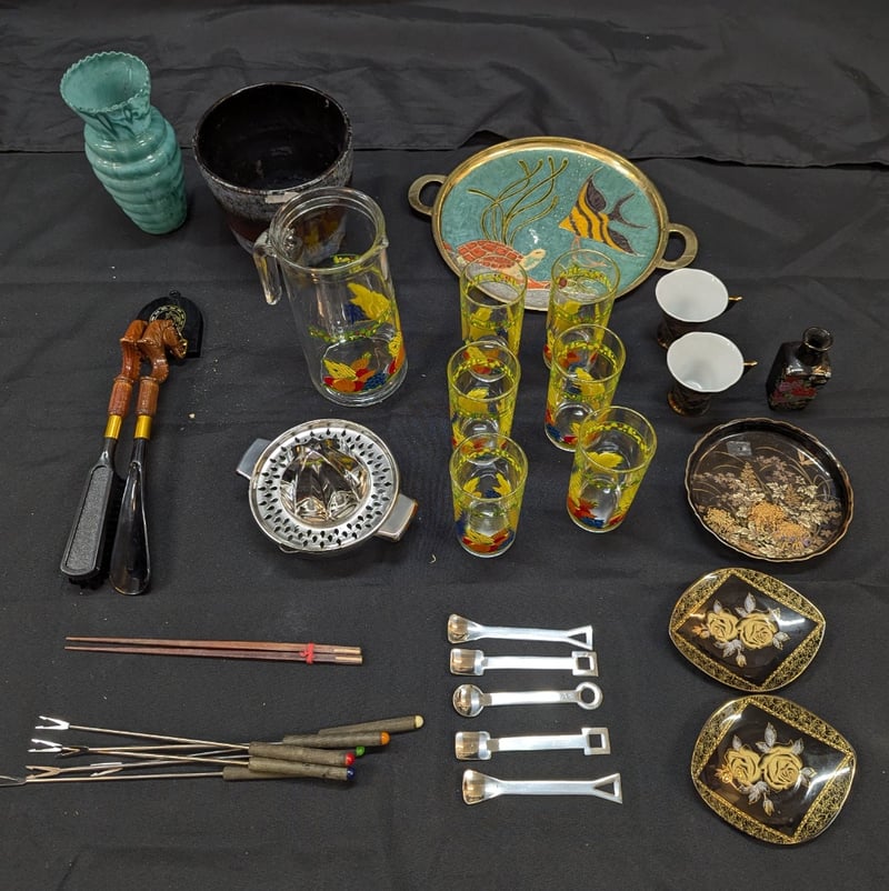 COLLECTION OF ESTATE ITEMSIncludes Arcosteel Hand Juicer, Fondue Fork Sets, Ceramic Pot, Milano Fine Porcelain Tea Set, Etc.Condition: Good - Refer To Images584936+16