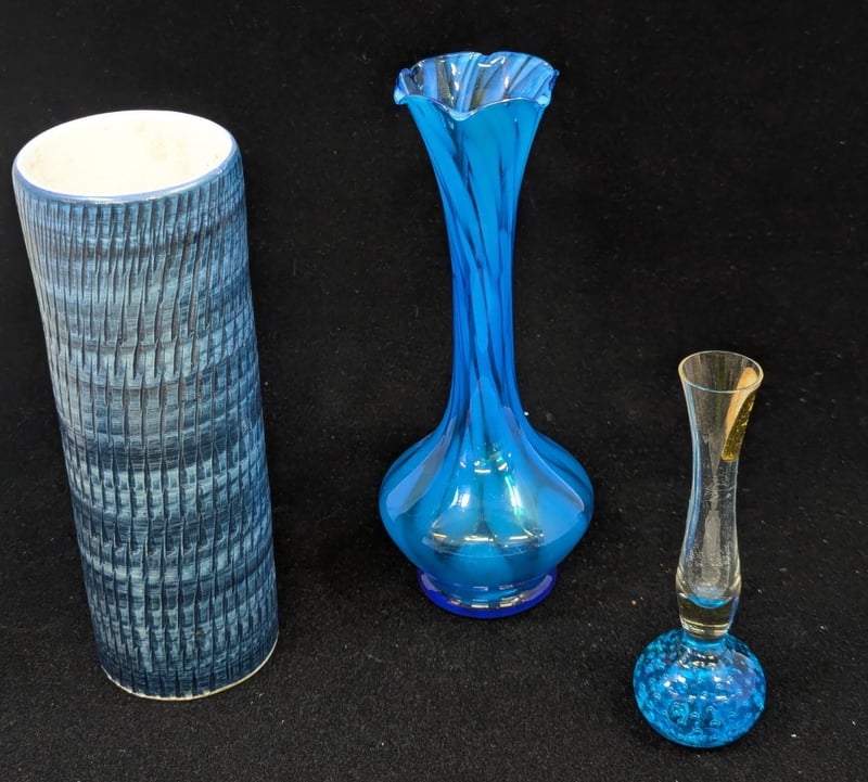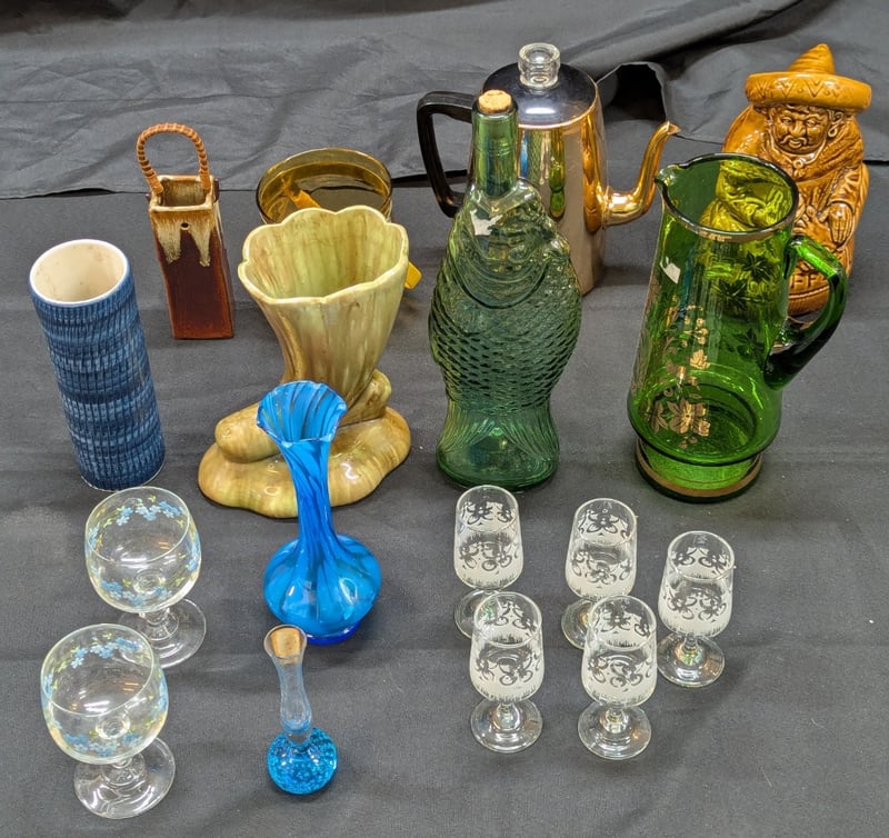 COLLECTION OF VASES AND KITCHENWAREIncludes Bubble Glass Vase, Flared Top Blue Vase, Fish Bottle With Cork, 2X Glassware Sets, Etc.Condition: Good - Refer To Images584936+18