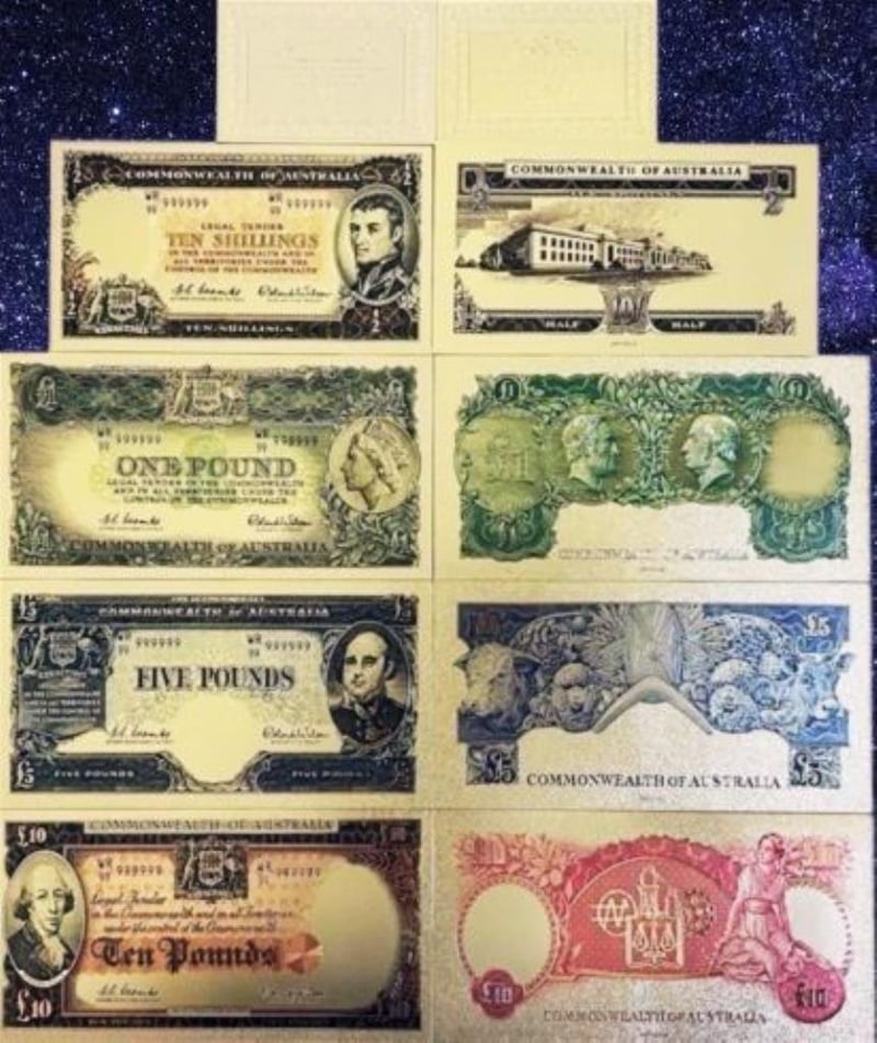 AUSTRALIA PRE BANK NOTE SET LIMITED EDITION RARE BANKNOTE ALBUM-GOLD PLATEDTHESE AMAZING LIMITED EDITION NOTES ARE PLATED WITH REAL 99.99% PURE GOLD-PLATED BANKNOTE OF AU, GIVING THEM A STUNNING AND LUXURIOUS LOOK.EACH NOTE FEATURES INTRICATE DETAILING, MAKING THEM HIGHLY SOUGHT AFTER BY COLLECTORS.THE PROTECTIVE FOLDER ENSURES THAT YOUR GOLD BANK NOTES ARE SAFE FROM DAMAGE, FADING, AND OTHER POTENTIAL HARM.IT ALSO MAKES IT EASY TO STORE AND DISPLAY YOUR COLLECTION.THESE NOTES ARE A MUST-HAVE FOR ANY COLLECTOR LOOKING TO ADD A TOUCH OF LUXURY TO THEIR COLLECTION.ACT FAST, AS THESE LIMITED EDITION NOTES ARE SURE TO SELL OUT QUICKLY.ADD ONE TO YOUR COLLECTION TODAY! PRODUCT FEATURES & BENEFITSLIMITED EDITION GOLD BANK NOTESPLATED WITH REAL GOLD FOR A LUXURIOUS LOOKFEATURES DESIGNS SHOWCASING THE HISTORY AND CULTURE OF AUCOMES IN A PROTECTIVE FOLDER TO KEEP THE NOTES SAFEEASY TO STORE AND DISPLAYTHESE GOLD BANK NOTES ARE A VALUABLE ADDITION TO ANY COLLECTION COMES WITH A GOLDEN CERTIFICATE OF AUTHENTICITYA GREAT WAY TO ADD A TOUCH OF LUXURY TO YOUR COLLECTION.KINDLY NOTES THIS IS NOT REAL GOLD...BUT GOLD PLATED ONLY 311106+89