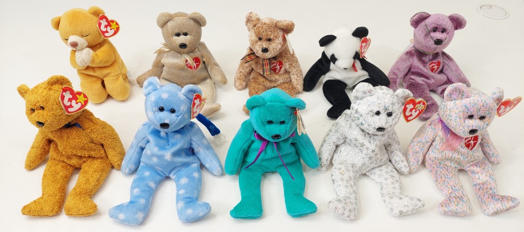 Assorted Beanie Babies QTY 10. Hope, 1999 Signature Bear, 2002 Signature Bear, Fortune, 2000 Signature Bear, Teddy 4051, Fuzz, 1999 Holiday Teddy, 2001 Signature Bear, and The Beginning.