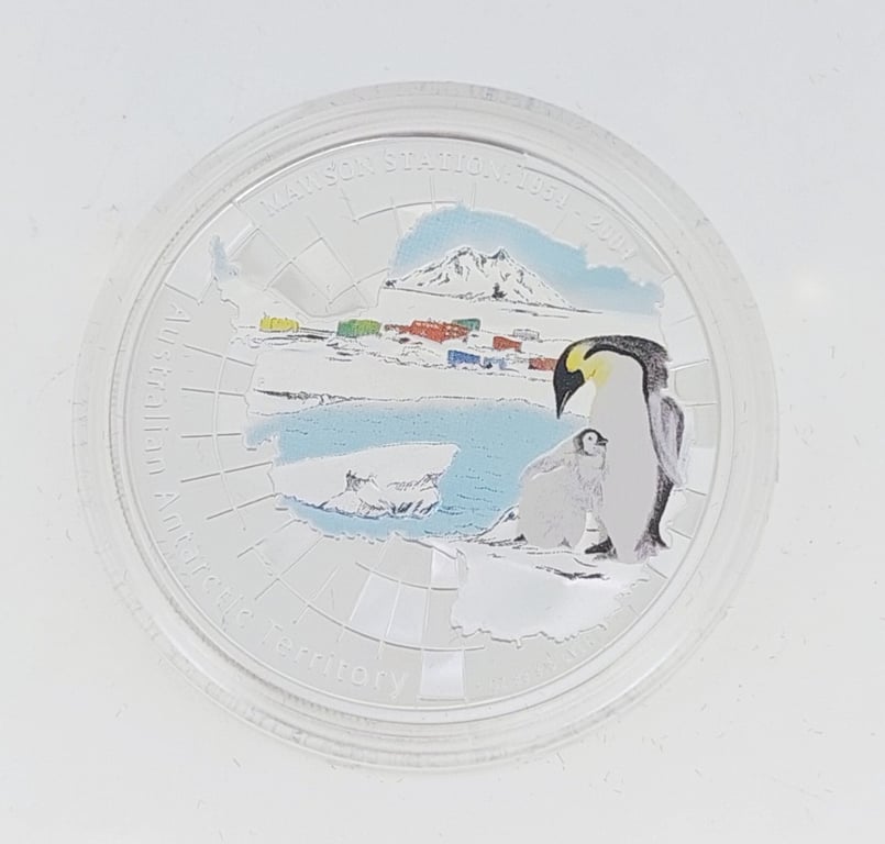 1954 - 2004 50TH ANNIVERSARY COMMERATIVE COIN AUSTRALIAN ANTARCTIC TERRITORY MAWSON STATION 1OZ SLIVER COIN488239+53