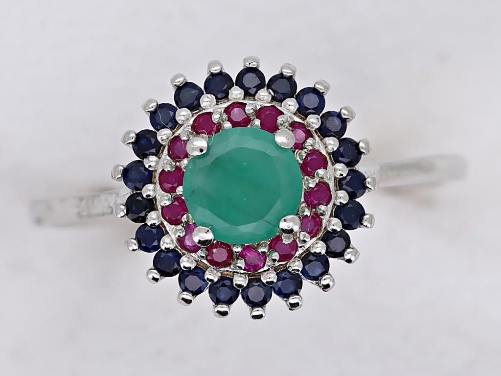 NATURAL EMERALD, RUBY SRI LANKAN SAPPHIRE (UNTREATED) RING ON 925 SILVER - WITH DIGITAL CERTIFICATE ONLY Gemstone : Natural Emerald, Ruby Sri Lankan Sapphire (Untreated)Certificate (Digital): Bigl20240122132869Item Total Weight : 2.12 GramsMain Stone Color : Vivid Green, Vivid Red, Royal BlueSize : 7Comments : Main Stone (Emerald) Indicate Minor Cedar Treatment.Surrounding Stones (Ruby Sri Lankan Sapphire (Untreated)) Have No Indications Of Heating.✻ Verify Report Online At Www.Bangkokinternationalgemlab.Co Condition: Good - Refer Images 01611140+27