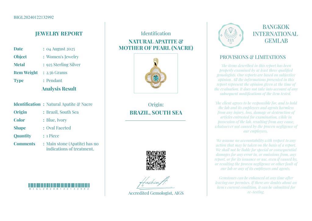 NATURAL APATITE & MOTHER OF PEARL (NACRE) PENDANT ON 925 SILVER - WITH DIGITAL CERTIFICATE ONLY Gemstone : Natural Apatite & Mother Of Pearl (Nacre)Certificate (Digital): Bigl20240122132992Item Total Weight : 2.56 GramsMain Stone Color : Blue, IvorySize : Comments : Main Stone (Apatite) Has No Indications Of Treatment.✻ Verify Report Online At Www.Bangkokinternationalgemlab.Co Condition: Good - Refer Images 01611140+35