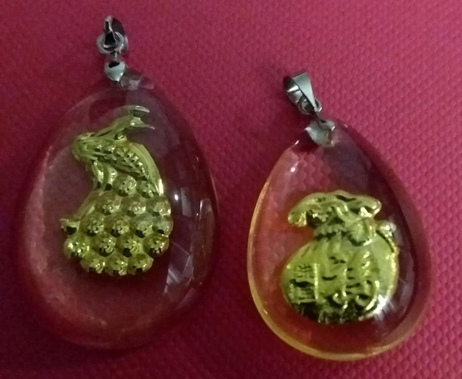 2 X CLEAR CRYSTAL PENDANTS WITH 999 GOLD LEAF PEACOCK AND MONEYBAGS Condition: Good - Refer Images 0162946+20FC