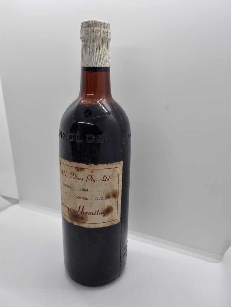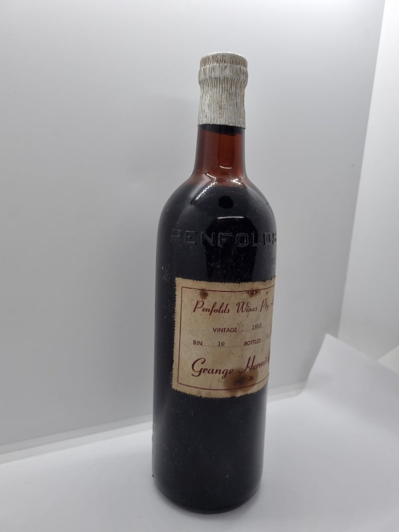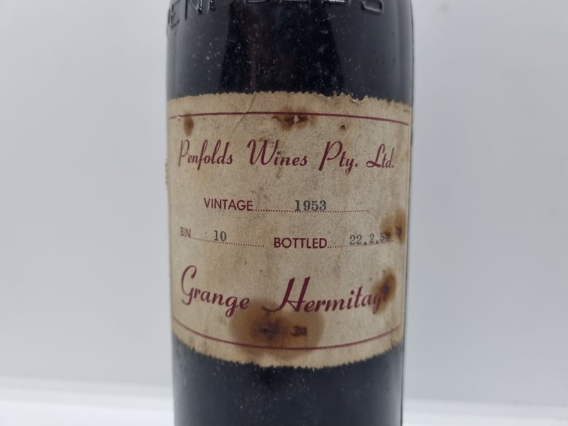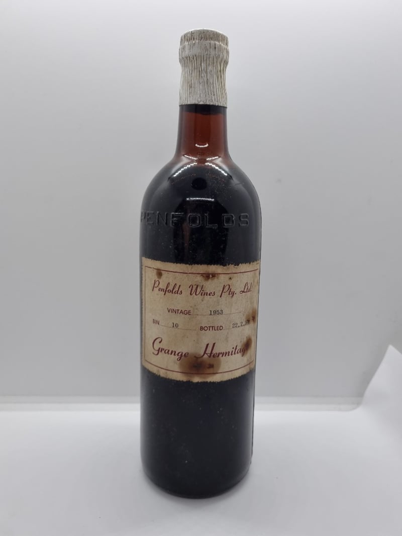 PENFOLDS GRANGE HERMITAGE BIN 10 , VINTAGE 1953, Bottled 22.2.54 , 1 PINT 6 fL OZ (650mL), COLOUR Medium brick red. NOSE Fresh mocha/apricot/meaty/Provencal herb/ polished leather aromas. PALATE A beautiful, velvet-textured wine with sweetfruit/roasted meat/mocha/herb/leather flavours and loose-knit, slinky, dry tannins. Finishes long and sweet. Price Guide - $11,500 - $27,500 (Based on market value)
