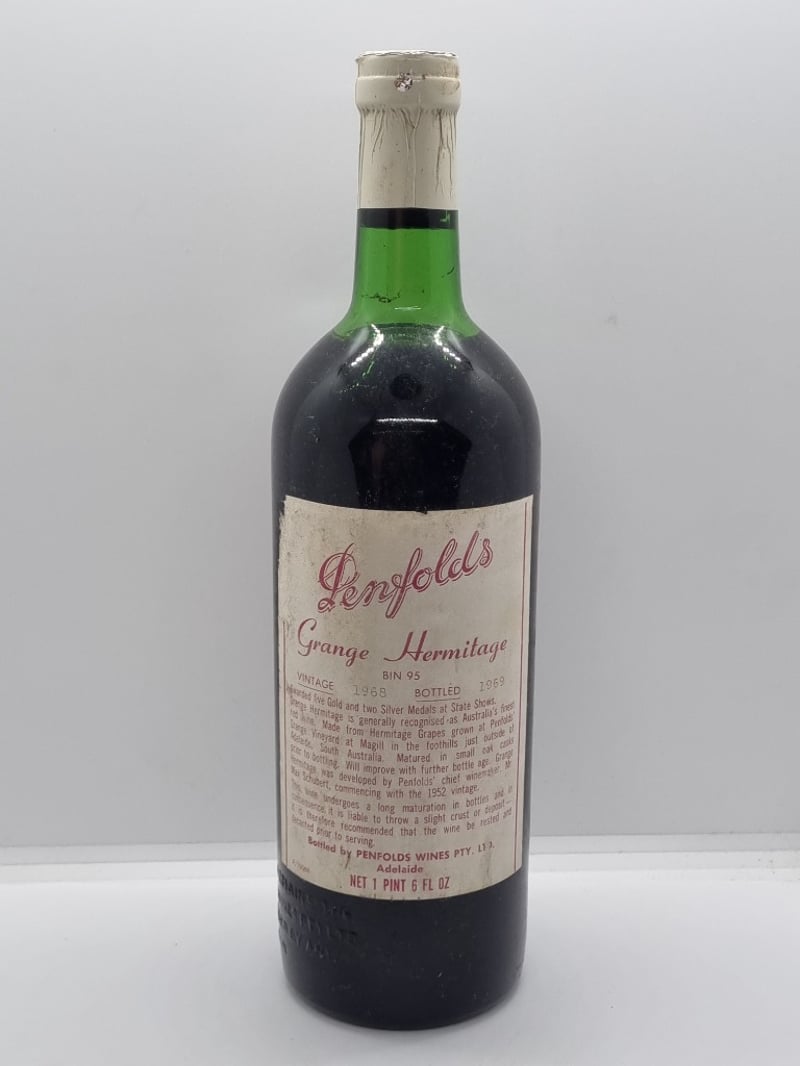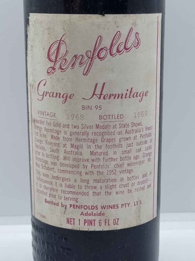 PENFOLDS GRANGE HERMITAGE BIN 95 , VINTAGE 1968, Bottled 1969, 1 PINT 6 fL OZ (650mL), COLOUR Medium brick red. NOSE Very developed, leathery/prune-like aromas. PALATE Beginning to dry out, with fading prune/leatherlike fruit flavours, fine but slightly green-edged tannins and dry finish. Price Guide - $950 - $1,950 (Based on market value)