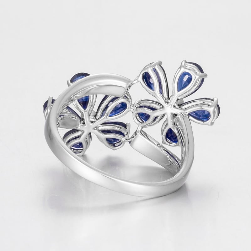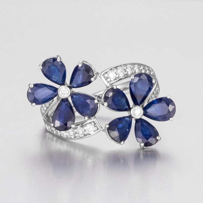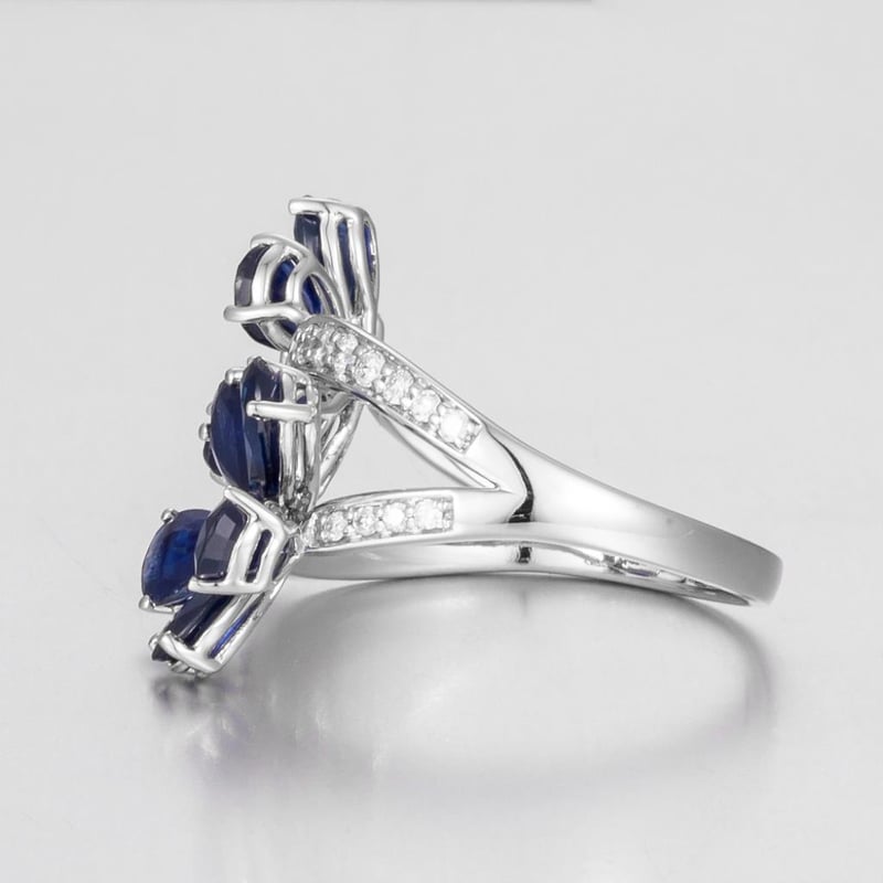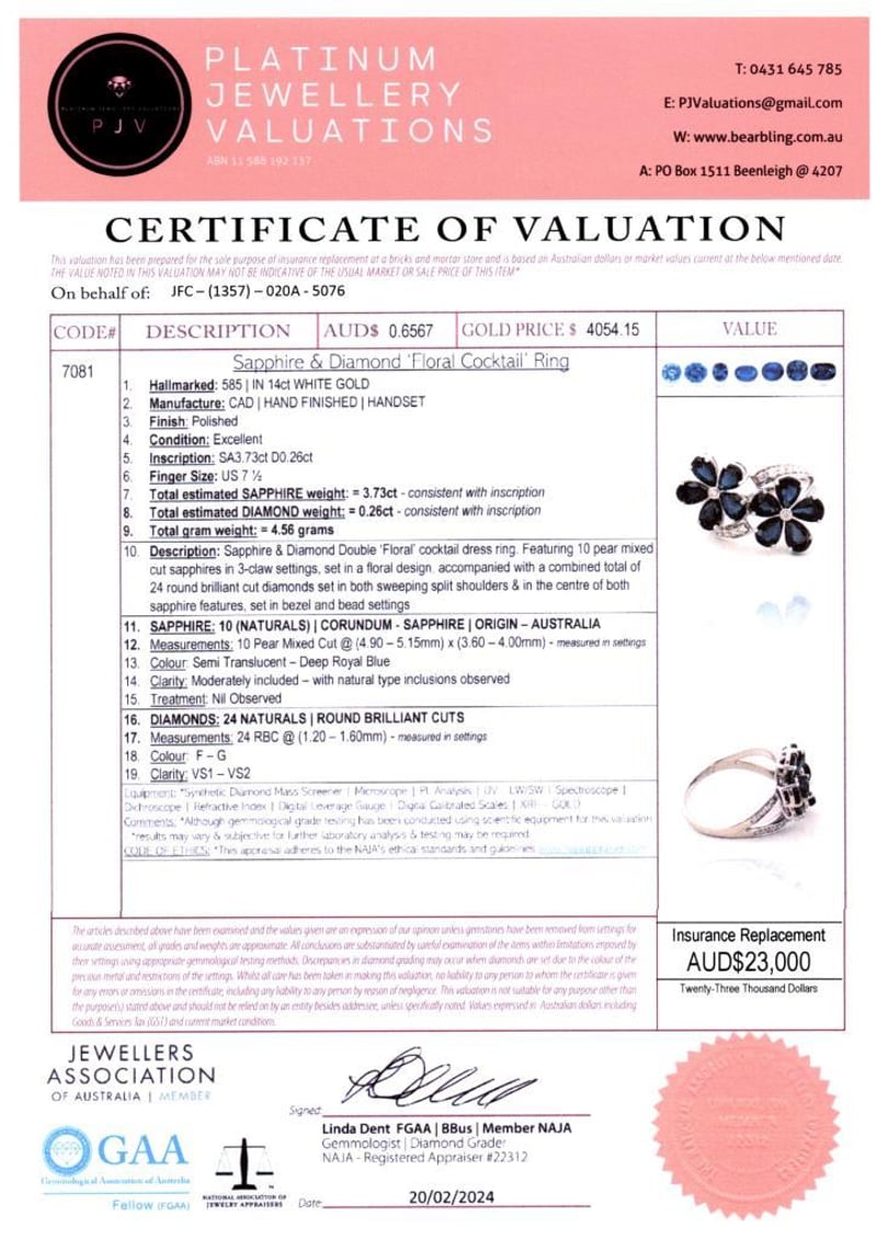 14CT WHITE GOLD AUSTRALIAN SAPPHIRE AND DIAMOND FLORAL TWIST RING FEATURING CENTRE, 10 PEAR CUT, DEEP ROYAL BLUE AUSTRALIAN SAPPHIRES (3.73CT TSW, MODERATELY INCLUDED), CLAW SET, WITH 24 ROUND BRILLIANT CUT DIAMONDS (0.26CT TDW, F-G COLOUR, VS1-VS2 CLARITY), BEAD SET. RING SIZE O.