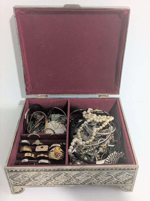 ASSORTED COSTUME JEWELLERY IN METAL ORNATE JEWELLERY BOX Size: 8cm x 19cm x 17cm Condition: Good - Refer To Images +1