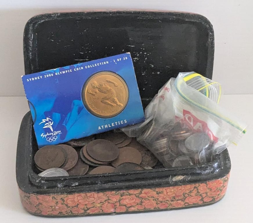 AUSTRALIAN & WORLD COINS IN FLORAL BOX Size: 16cm x 12cm x 5cm Condition: Fair - Refer To Images +2