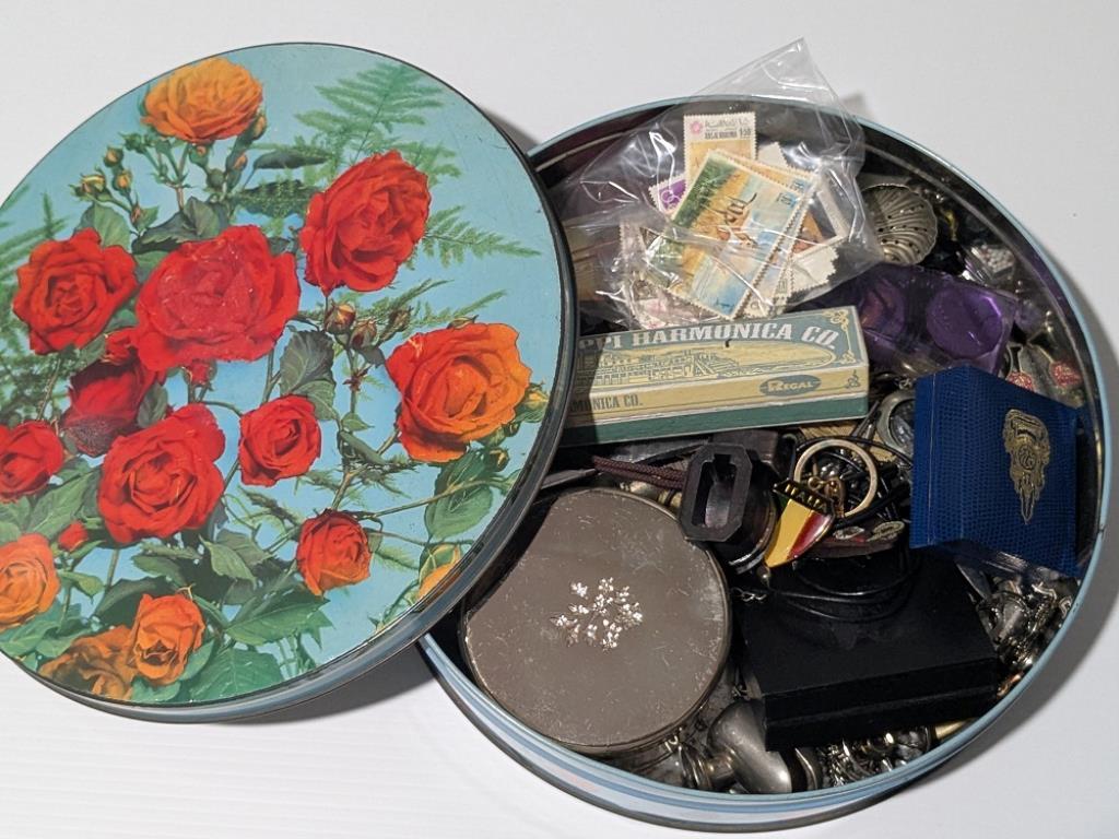 ASSORTED TRINKETS & BADGES IN FLORAL TIN BOX Includes Harmonica, Stamps, Zippo Lighter, Badges, Keyrings & Tiny Pocket Knife Size: 27cm x 8cm Condition: Good - Refer To Images +5