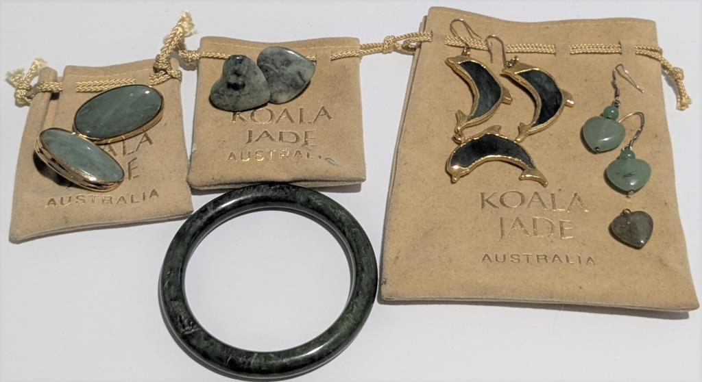 JADE & GEMSTONE JEWELLERY Includes Koala Jade Dolphins, Earrings & Green Gemstone Bangle Condition: Good - Refer To Images +12