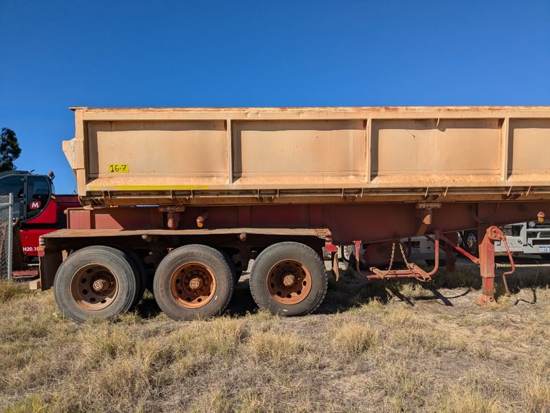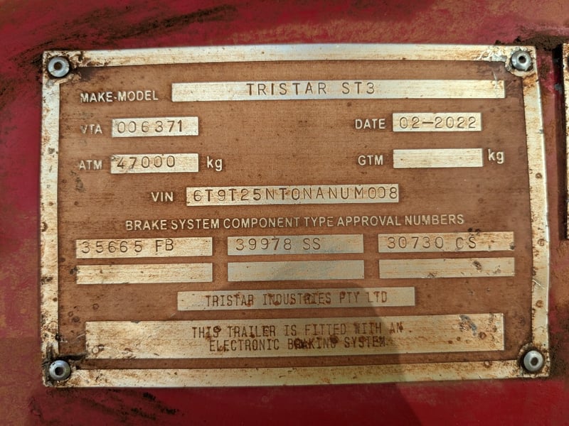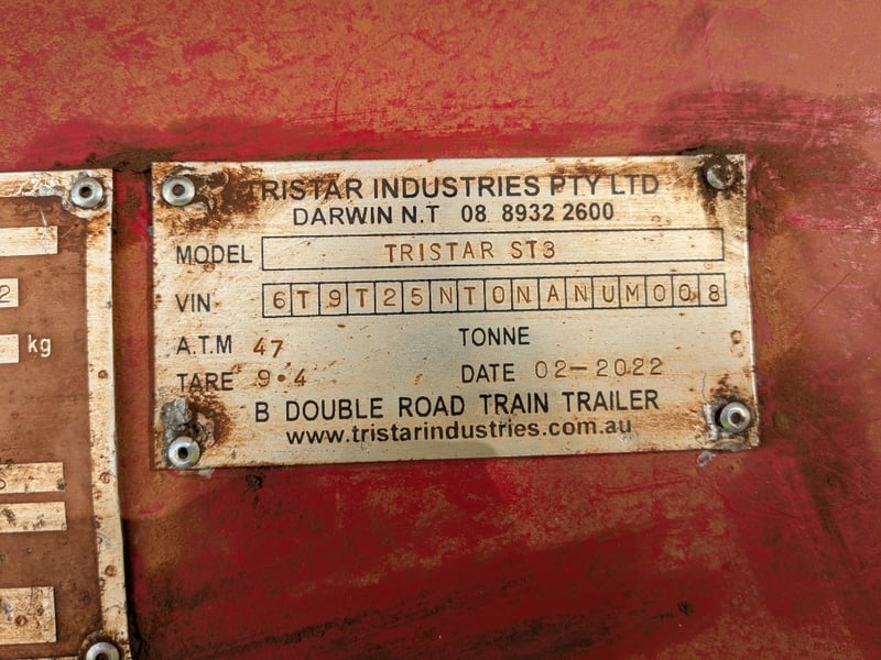 2022 Tri Star ST3 Side Tipper B Double Road Train Trailer – Built for Bulk HaulageYear: 2022Make: Tri Star IndustriesModel: ST3Body Type: Side Tipper B Double Road Train TrailerATM: 47,000 kgTARE: 9,400 kgColour: Red chassis with white tipper bodyConfiguration: Tri-AxlSuspension: Heavy-duty spring suspensionBraking System: Fitted with an electronic braking system (ADR compliant)Condition: In used condition with visible surface rust and wear from operational use. Structurally sound with working hydraulics and a Ringfeder coupling setup.Ideal for mining, quarrying, or regional bulk transport operations.VIN / Chassis No.: 6T9T25NT0NANUM008For more information Contact: 0489 996 389 or Email: [email protected] Key #: LIQ21Motor Dealer Licence # MD27332