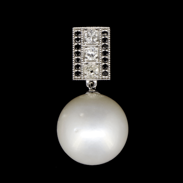 14K WHITE GOLD, WHITE CULTURED SOUTH SEA PEARL, BLACK DIAMOND AND DIAMOND, PENDANT. The Design Features, One Near Round, White With Silver Overtones, Cultured South Sea Pearl (21.14Ct, 14.20Mm-15.20Mm Size, Natural Growth Blemishes). Decorating The Bail Are 3 Round Brilliant Cut, Diamonds (0.34Ct Tdw, H-J Colour, Si-P1 Clarity), And 14 Black Diamonds (0.10Ct Tdw, Opaque) Claw Set. Valuations Provided by an Independent Third-Party Professional Not Directly Associated With Lloyds Auctions at AUD $$9,500.00This valuation has been conducted by an independent third-party professional. The valuation amount is an assessment by the issuing valuer and does not reflect the auction value of the item. Any inquiries regarding the valuation should be directed to the issuing valuer (refer to contact details on the certificate), as Lloyds Auctions has no affiliation or influence over the valuation, the valuer, or the stated amount. Condition: Good - Refer Images 0645841+387