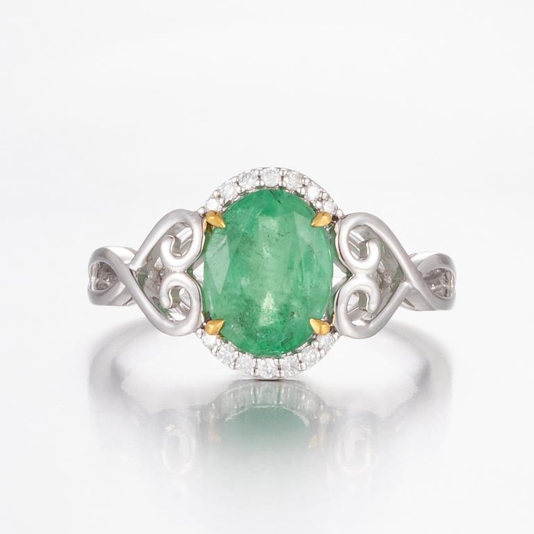 14CT WHITE GOLD ZAMBIAN EMERALD AND DIAMOND DRESS RING . Featuring Centre, One Oval Cut, Blue Green Zambian Emerald (1.80Ct, Moderately Included), Claw Set In Yellow Gold, With 14 Round Brilliant Cut Diamonds (0.08Ct Tdw, F-G Colour, Vs2 Clarity), Bead Set. Ring Size O. Valuations Provided by an Independent Third-Party Professional Not Directly Associated With Lloyds Auctions at AUD $12000This valuation has been conducted by an independent third-party professional. The valuation amount is an assessment by the issuing valuer and does not reflect the auction value of the item. Any inquiries regarding the valuation should be directed to the issuing valuer (refer to contact details on the certificate), as Lloyds Auctions has no affiliation or influence over the valuation, the valuer, or the stated amount. Condition: Good - Refer Images 0586115+1274