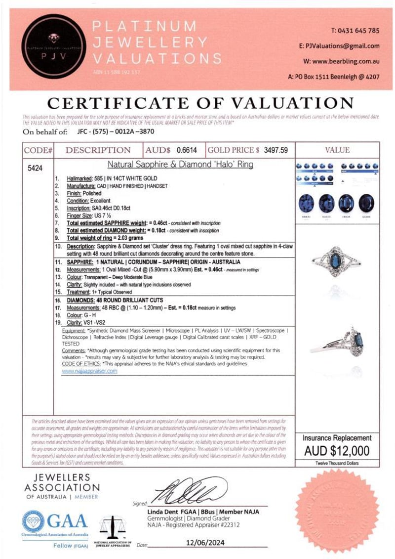 14CT WHITE GOLD AUSTRALIAN SAPPHIRE AND DIAMOND DRESS RING. Featuring Centre, One Oval Cut, Deep Moderate Blue Australian Sapphire (0.46Ct, Slightly Included), Claw Set, With 48 Round Brilliant Cut Diamonds (0.18Ct Tdw, G-H Colour, Vs1-Vs2 Clarity), Bead Set. Ring Size O. Valuations Provided by an Independent Third-Party Professional Not Directly Associated With Lloyds Auctions at AUD $12000 This valuation has been conducted by an independent third-party professional. The valuation amount is an assessment by the issuing valuer and does not reflect the auction value of the item. Any inquiries regarding the valuation should be directed to the issuing valuer (refer to contact details on the certificate), as Lloyds Auctions has no affiliation or influence over the valuation, the valuer, or the stated amount. Condition: Good - Refer Images 0 586115+1281