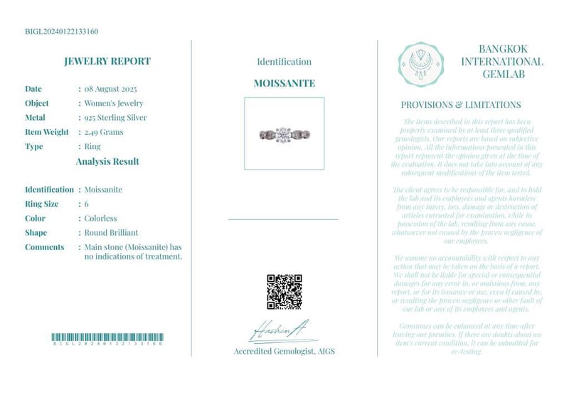 MOISSANITE RING ON 925 SILVER - WITH DIGITAL CERTIFICATE ONLY Gemstone : MoissaniteCertificate (Digital): Bigl20240122133160Item Total Weight : 2.49 GramsMain Stone Color : ColorlessSize : 6Comments : Main Stone (Moissanite) Has No Indications Of Treatment.✻ Verify Report Online At Www.Bangkokinternationalgemlab.Co Condition: Good - Refer Images 01611139+46