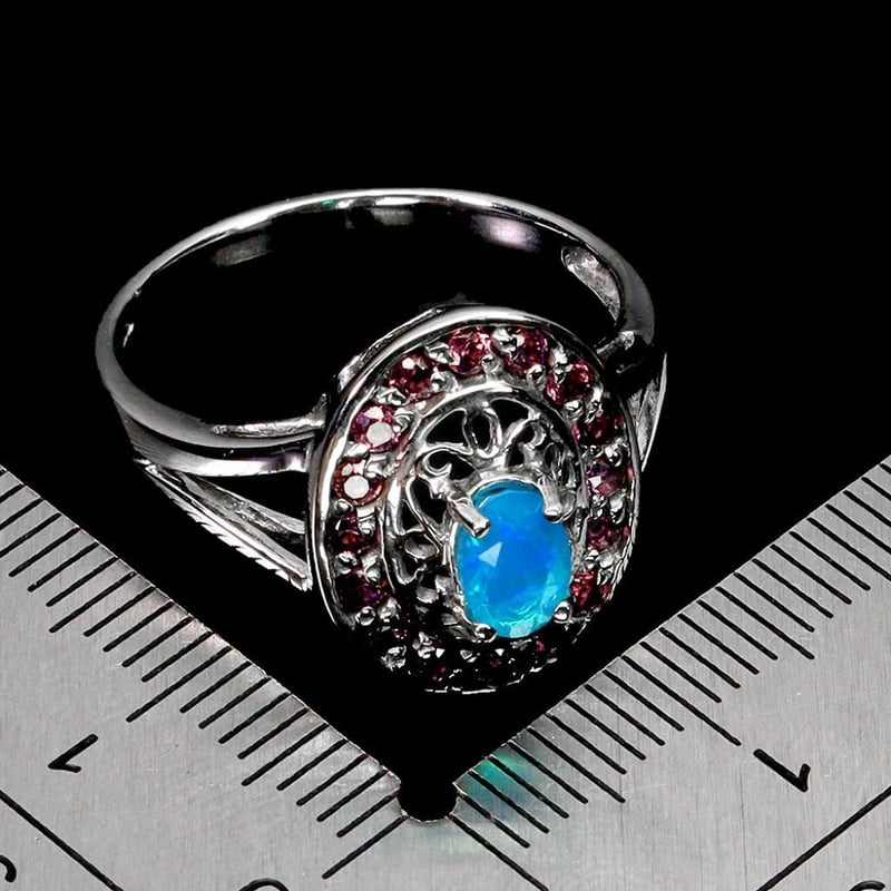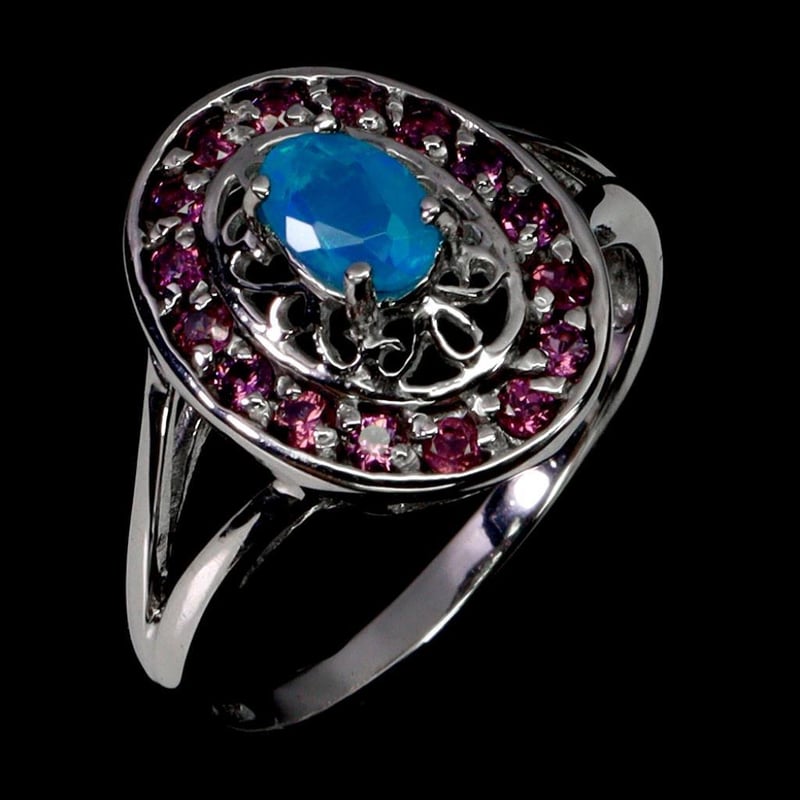NATURAL BLUE OPAL & GARNET RING. Natural Blue Opal & Garnet Ring. Made In Solid Sterling Silver And Plated In14K White Gold. Featurees Natural Blue Opal And Natural Rhodolite Garnet. Ring Size 9 Condition: Good - Refer Images 0488279+10