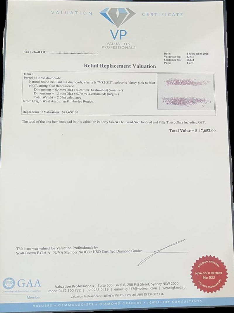 2.09 TCW PARCEL OF NATURAL ROUND BRILLIANT CUT FANCY PINK TO FAIN PINK ORIGIN WEST AUSTRALIA KIMBERLEY REGION VALUATION $47,652 2.09 Tcw Parcel Of Natural Round Brilliant Cut Fancy Intense Purple Pink To Fain Pink Origin West Australia Kimberley Region With Retail Replacment Valuation Report Vp-$47,652--Western Australia Argyle-Rare....With Valuation $47410-Rare Color....With Technical Report...2.09 Carat Is Very Scarce Nestled Deep Within The Rugged Terrain Of Western Australia Lies One Of The World`S Most Extraordinary Treasures The Australian Argyle Intense Pink Diamonds. Born Over Billions Of Years Under Intense Geological Pressure, These Rare Gems Are As Timeless As They Are Breathtaking. The Argyle Mine, Renowned For Its Exclusivity And Finite Supply, Has Been The Sole Source Of These Coveted Argyle Intense Orangy Pinkdiamonds, Making Each Stone A True Marvel Of Nature`S Artistry. Embrace The Allure Of Rarity With Our Exclusive Australian Argyle Orangy Pink Diamonds Collection Each Stone In This Exquisite Selection Embodies The Unparalleled Beauty And Prestige Of These Elusive Gems. With Their Natural Brilliance, Our Collection Offers A Range Of Possibilities For Designing And Creating. Whether As A Token Of Love Or A Statement Of Refinement Valuations Provided by an Independent Third-Party Professional Not Directly Associated With Lloyds Auctions at AUD $47652 This valuation has been conducted by an independent third-party professional. The valuation amount is an assessment by the issuing valuer and does not reflect the auction value of the item. Any inquiries regarding the valuation should be directed to the issuing valuer (refer to contact details on the certificate), as Lloyds Auctions has no affiliation or influence over the valuation, the valuer, or the stated amount. 0 311095+1