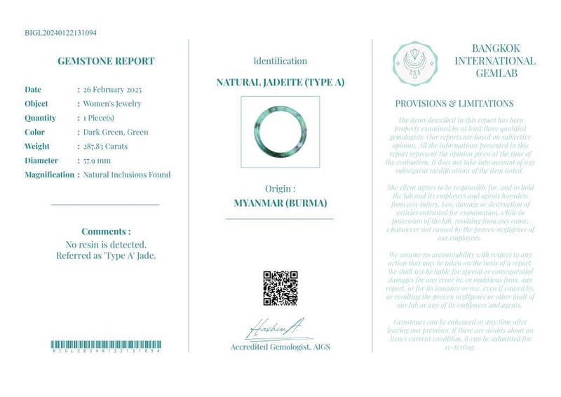 NATURAL BURMESE JADE BANGLE - WITH DIGITAL CERTIFICATE ONLY Gemstone : Natural Burmese JadeCertificate (Digital): Bigl20240122131094Item Total Weight : 287.83 GramsMain Stone Color : Dark Green, GreenSize : 57.9Comments : No Resin Is Detected.Referred As 'Type A' Jade.✻ Verify Report Online At Www.Bangkokinternationalgemlab.Co Condition: Good - Refer Images 01611139+4