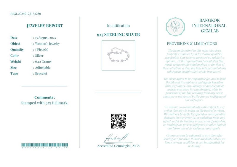 925 STERLING SILVER BRACELET - WITH DIGITAL CERTIFICATE ONLY Gemstone : 925 Sterling SilverCertificate (Digital): Bigl20240122133250Item Total Weight : 6.42 GramsMain Stone Color : SilverSize : AdjustableComments : Stamped With 925 Hallmark.✻ Verify Report Online At Www.Bangkokinternationalgemlab.Co Condition: Good - Refer Images 01611139+52