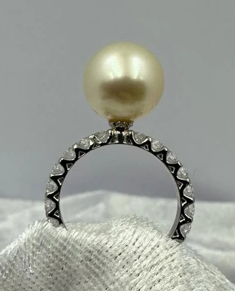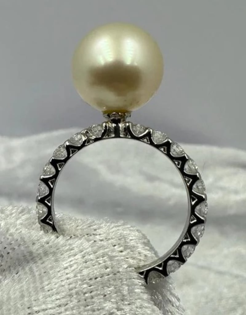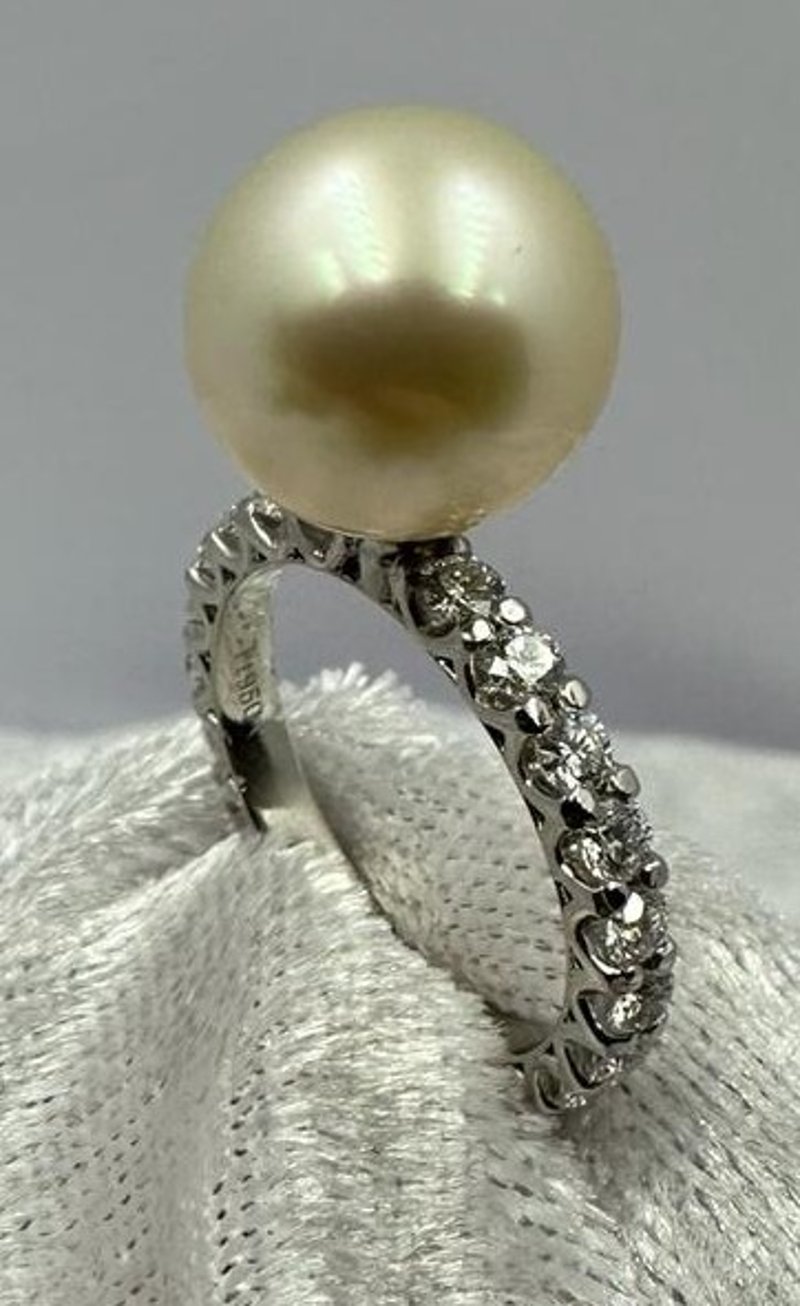 PLATINUM 950 SHARED CLAW DIAMOND BAND RING WITH A 12MM ROUND AUSTRALIAN SOUTH SEA PEARLCentre Gem: 12Mm Round Australian South Sea Pearl. White/Gold In Colour, Aaa Rated. Side Stones: 22 X 0.05 Ct Round Brilliant Natural Diamonds, 1.10 Ct Total Carat Weight. Platinum 950, 6.8 Grams. Size MCondition: Good - Refer To ImagesCROSSDOCK162955+24
