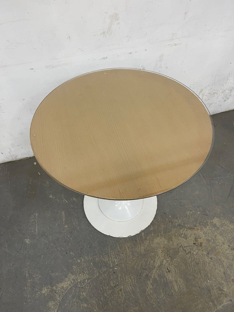 Cafe style/round pedestal table, timber finish surface protected by a glass cover, circular metal base. H: 76cm W: 76cm D: 76cm Note: Possible Signs of Wear and Tear