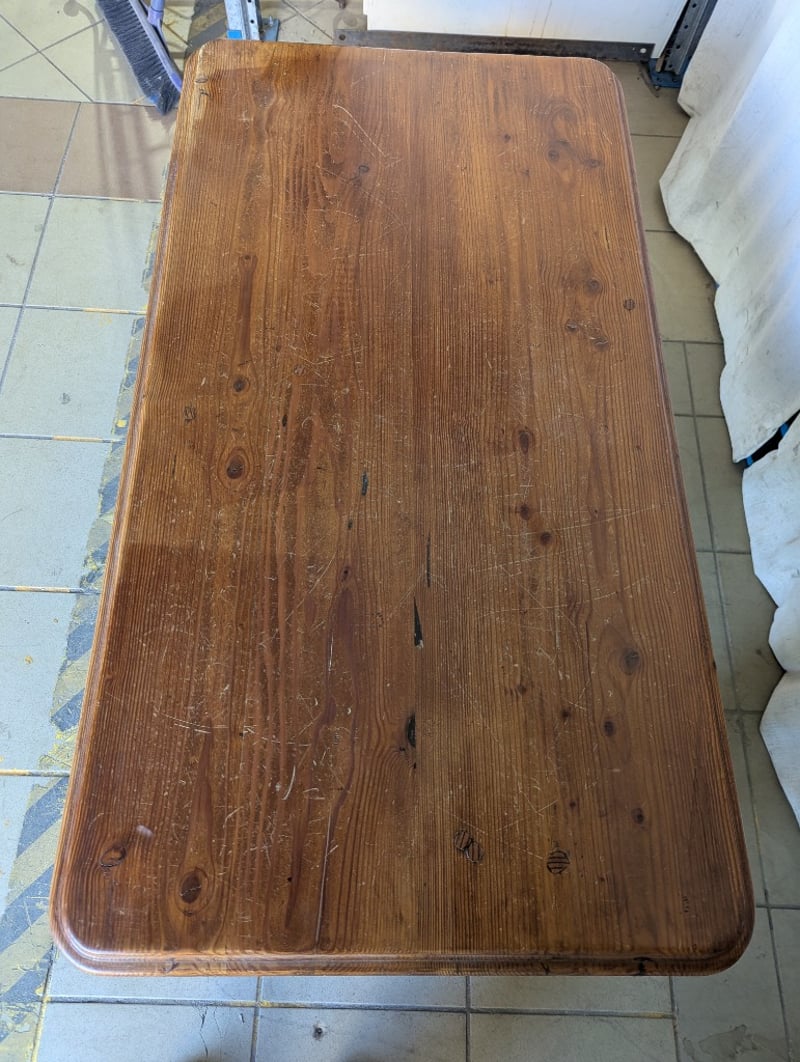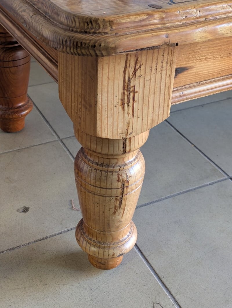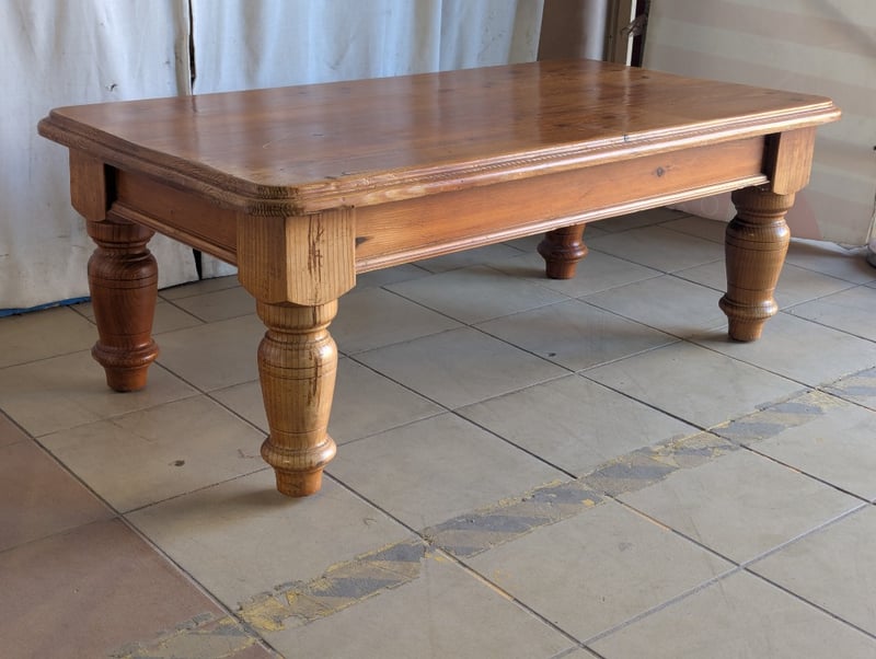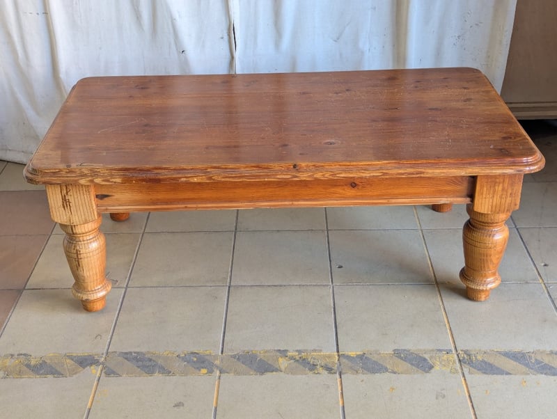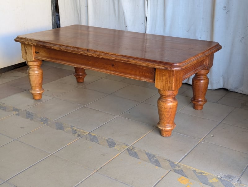 Coffee table, timber, round turned legsNote: general wear and tear Dimensions: H 50cm x W 135cm x D 72cm