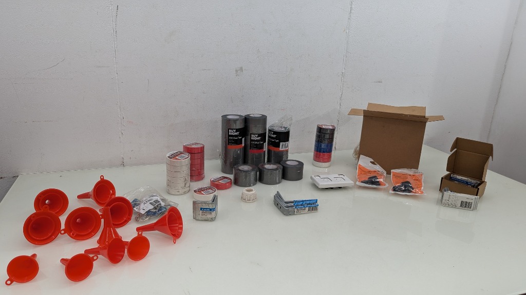 Assorted Pack, Includes Various Angle Brackets, Duct Tape, Funnels andore, Quantity Per Lot Sold As Lot