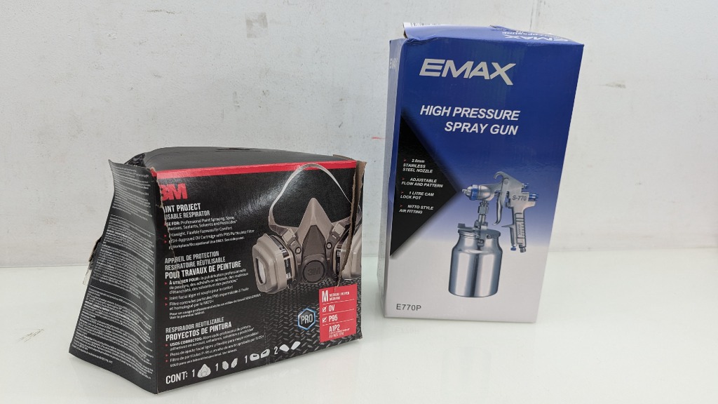EMax High Pressure Spray Gun, Model: E770P, 3M Paint Project Reusable Respirator, Size: Medium, Quantity 2Sold As Lot