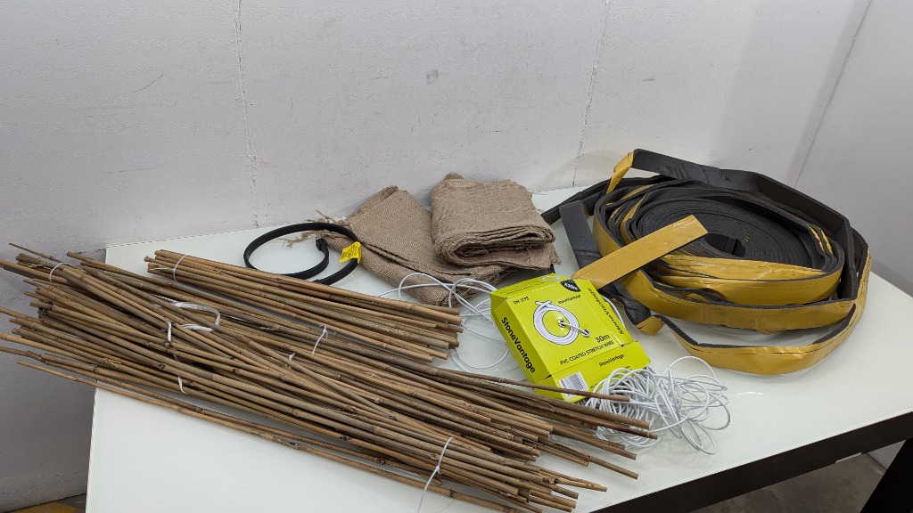 Assorted Bundle, Includes PVC Coated Stretch Wire, Hessian Bags, Bamboo Stakes andore, Quantity Per Lot Sold As Lot
