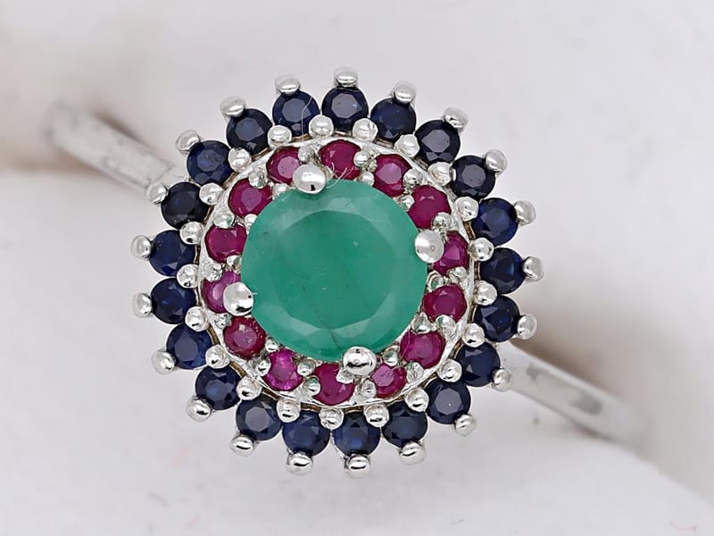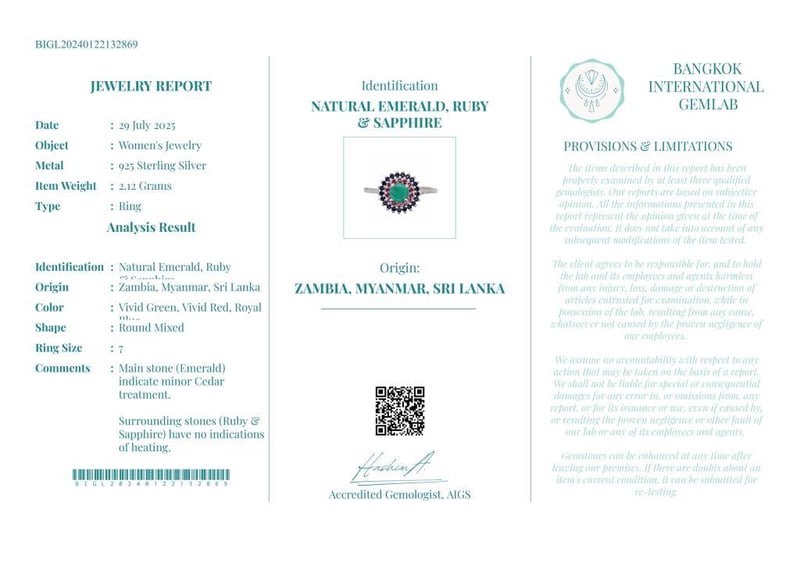 NATURAL EMERALD, RUBY SRI LANKAN SAPPHIRE (UNTREATED) RING ON 925 SILVER - WITH DIGITAL CERTIFICATE ONLY Gemstone : Natural Emerald, Ruby Sri Lankan Sapphire (Untreated)Certificate (Digital): Bigl20240122132869Item Total Weight : 2.12 GramsMain Stone Color : Vivid Green, Vivid Red, Royal BlueSize : 7Comments : Main Stone (Emerald) Indicate Minor Cedar Treatment.Surrounding Stones (Ruby Sri Lankan Sapphire (Untreated)) Have No Indications Of Heating.✻ Verify Report Online At Www.Bangkokinternationalgemlab.Co Condition: Good - Refer Images 01611140+27