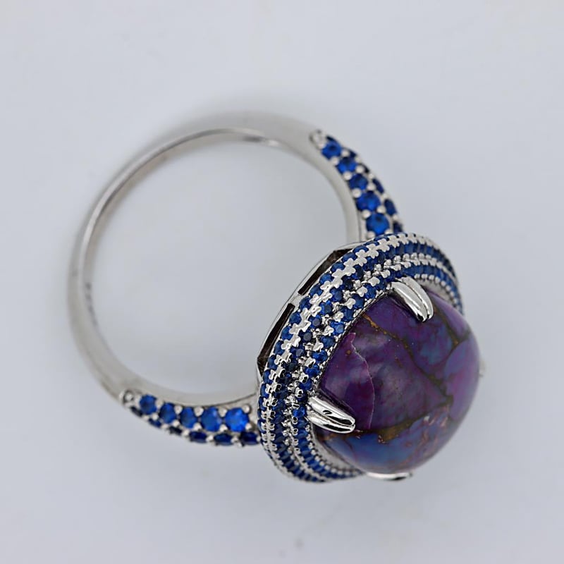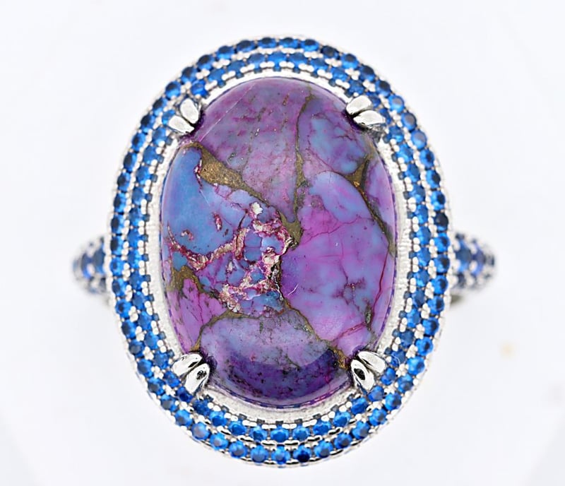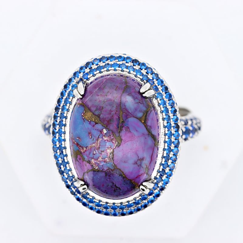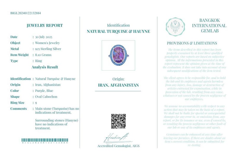 NATURAL MOHAVE TURQUISE & HAUYNE RING ON 925 SILVER - WITH DIGITAL CERTIFICATE ONLY Gemstone : Natural Mohave Turquise & HauyneCertificate (Digital): Bigl20240122132884Item Total Weight : 8.1 GramsMain Stone Color : Purple, BlueSize : 9Comments : Main Stone (Turquoise) Has No Indications Of Treatment.Surrounding Stones (Hauyne) Have No Indications Of Treatment.✻ Verify Report Online At Www.Bangkokinternationalgemlab.Co Condition: Good - Refer Images 01611140+28