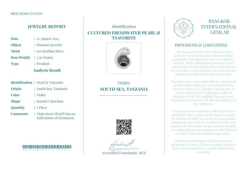 CULTURED PEARL & TSAVORITE PENDANT ON 925 SILVER - WITH DIGITAL CERTIFICATE ONLY Gemstone : Cultured Freshwater Pearl & TsavoriteCertificate (Digital): Bigl20240122133221Item Total Weight : 5.27 GramsMain Stone Color : VioletSize : Comments : Main Stone (Pearl) Has No Indications Of Treatment.✻ Verify Report Online At Www.Bangkokinternationalgemlab.Co Condition: Good - Refer Images 01611140+50