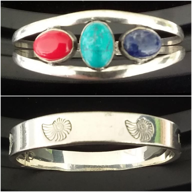 925 SILVER PLATED GEMSTONE BRACELET WITH SHELL PATTERN OPENING BANGLE Condition: Good - Refer Images 0162946+35FC