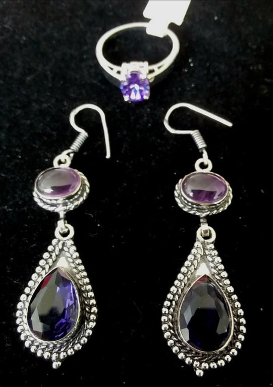 925 SILVER AMETHYST RING WITH LONG SILVER AND AMETHYST DROP EARRINGS Condition: Good - Refer Images 0162946+18FC