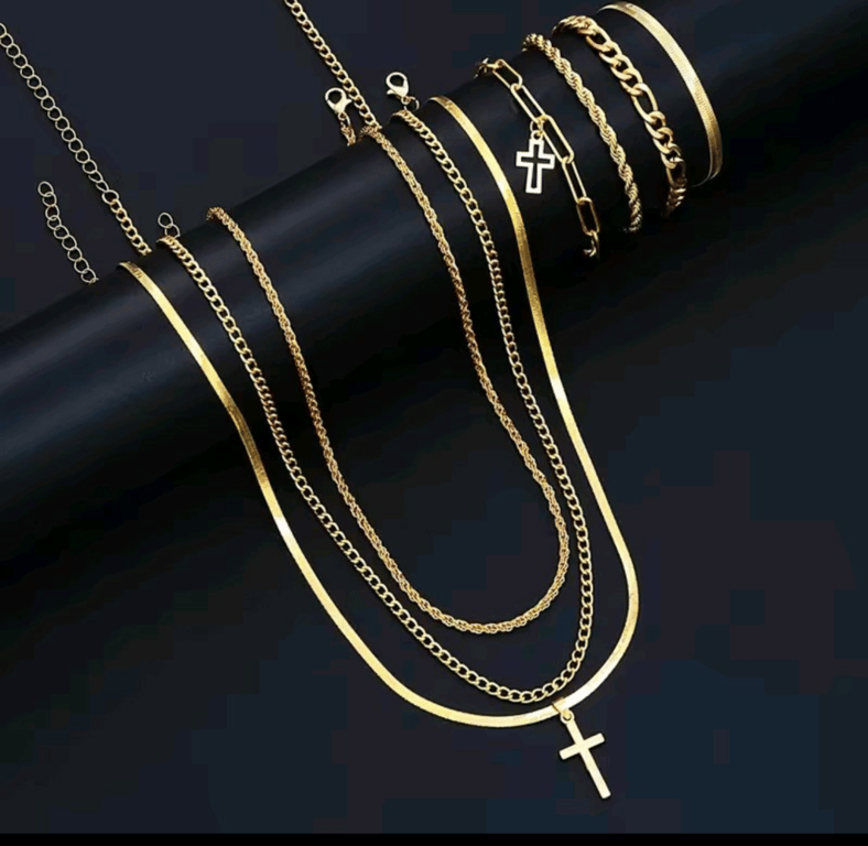 7 X GOLD STAINLESS STEEL UNISEX NECKLACES AND BRACELETS SET Condition: Good - Refer Images 0162946+40FC
