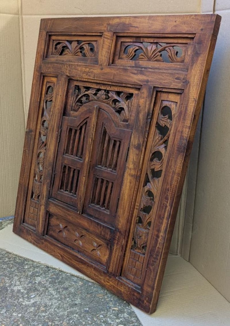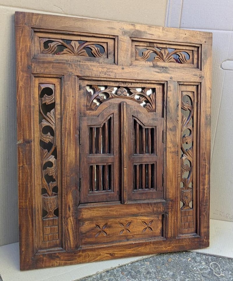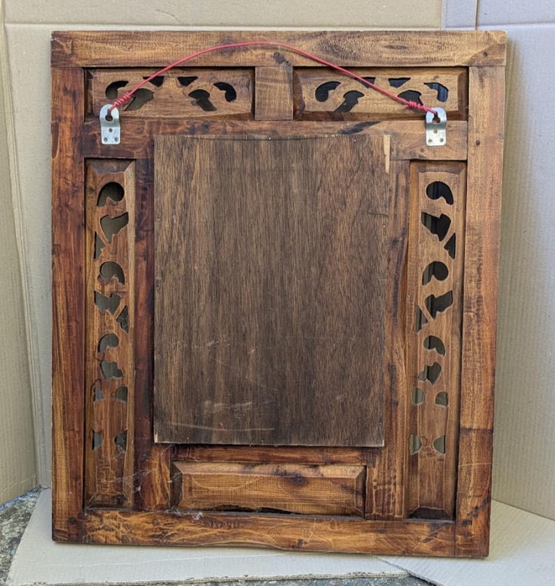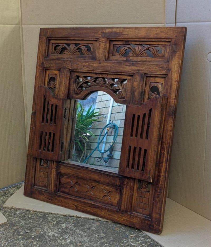 BALINESE WOOD CARVED WINDOW MIRROR 60CM X70CM - WALL HANG