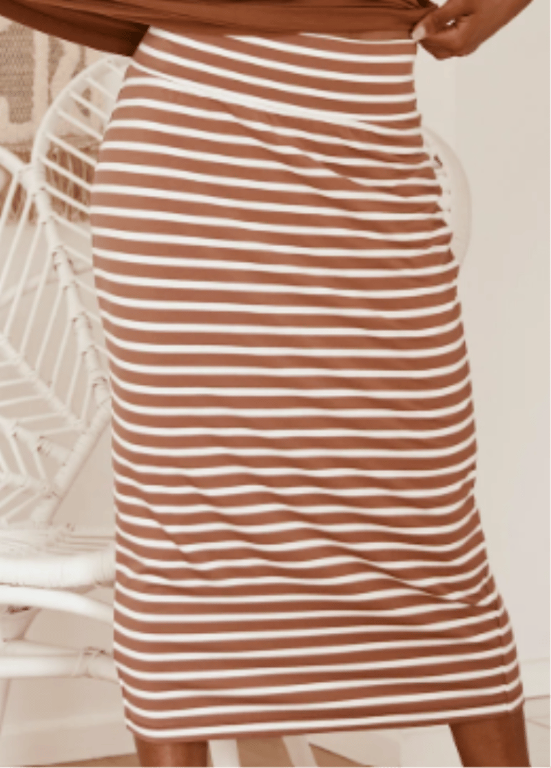 RRP - $125.00 per unit BULK LOT The Long Whitney Tube Skirt 16NB002 Toffee + White Stripe Size fits M-L Quantity ranges from 20-40