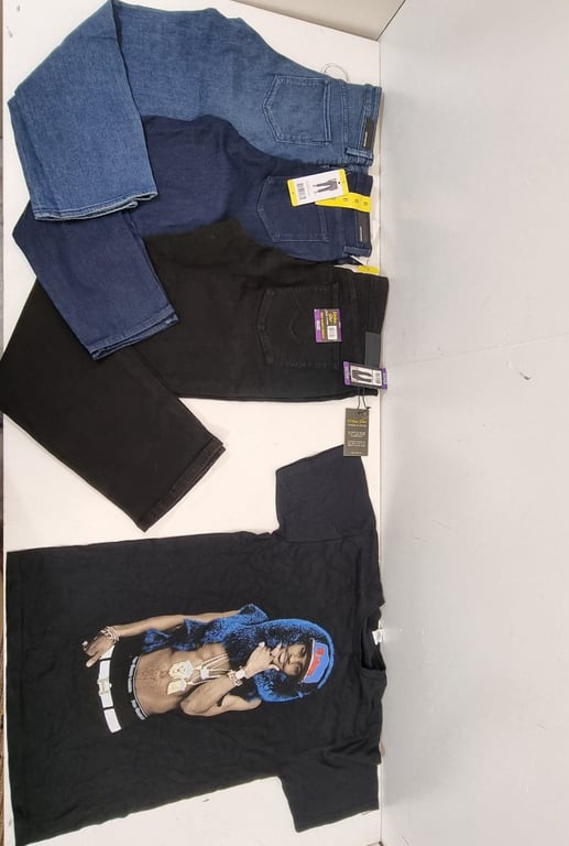 Box of Brand New Mens and Womens Printed T-Shirts, Jeans and Hoodies, Brands Include DKNK, Urban Star,JAG and More Sizes Fits: 6,40x33,L,XL,28