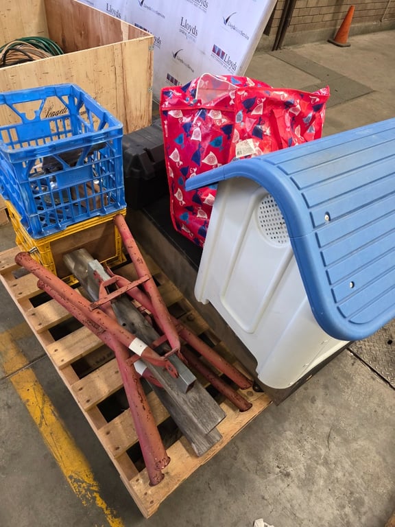 Assorted items, Includes dog house, cabinet, Mirror head and moreSold as lot