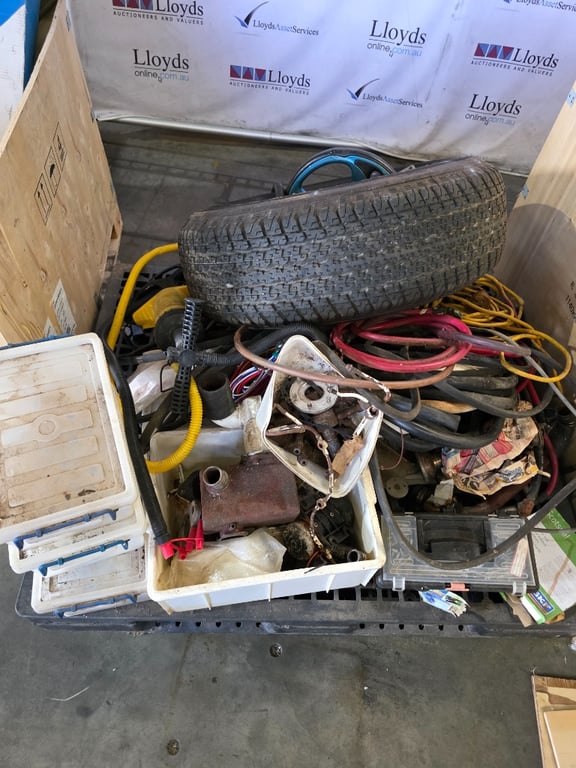 Assorted items including hardware, hand pump, tyre and more Sold as lot