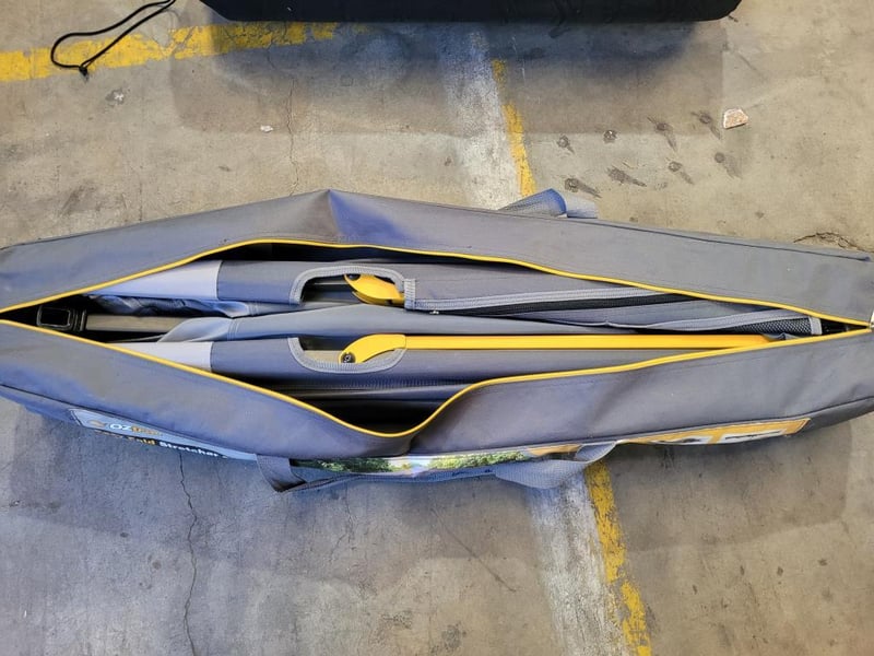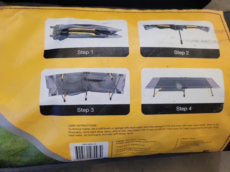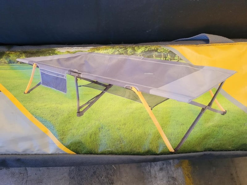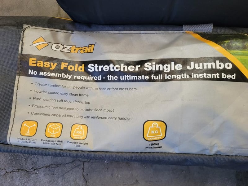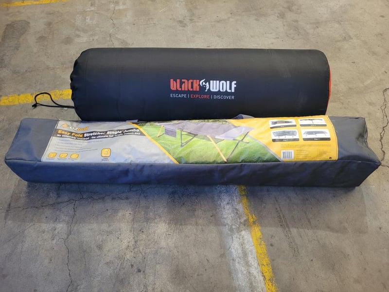 Oztrail Single Strecher and Black Wolf Air MattressDescription: Easy fold single jumbo stretcher, full length camping bed, W 210cm x D 90cm x H 42cm, max capacity 150kg. Black Wolf single 3D air mattress, self inflating, non-slip base.