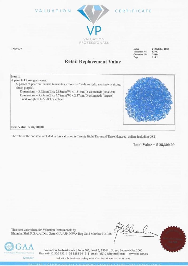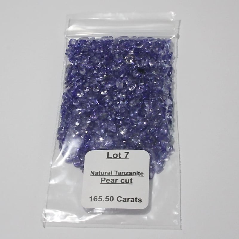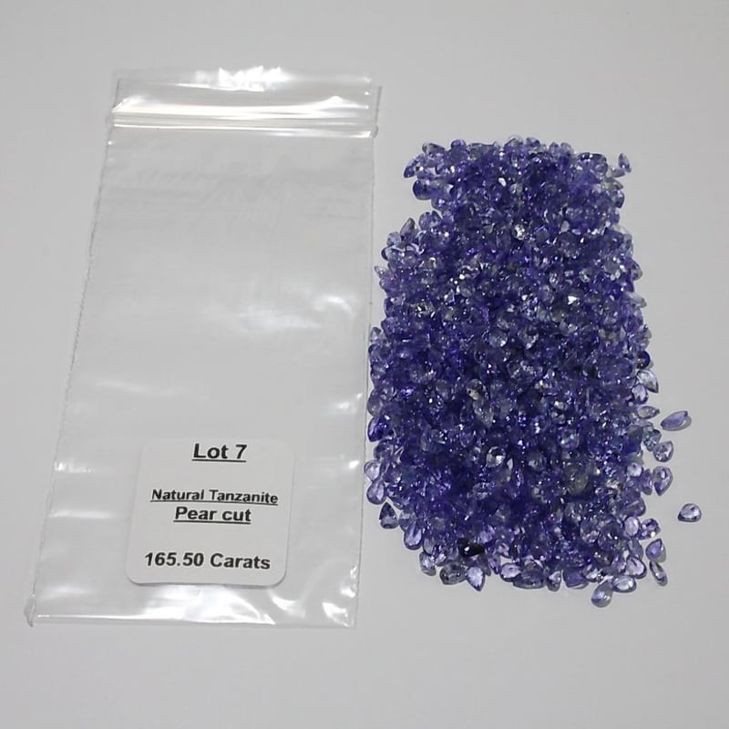 A PARCEL OF PEAR CUT NATURAL TANZANITES A Parcel Of Loose Gemstones. A Parcel Of Pear Cut Natural Tanzanites, Colour Is "Medium Light, Moderately Strong, Bluish Purple". Dimensions= 3.92Mrn(L) X 2.88Mm(W) X L .8Lrnm(D-Estimated) (Smallest) Dimensions= 5.85Mrn(L) X 3.78Mm(W) X 2.37Mm(D-Estirnated) (Largest) Total Weight= 165.S0Ct Calculated Valuations Provided by an Independent Third-Party Professional Not Directly Associated With Lloyds Auctions at AUD $28300This valuation has been conducted by an independent third-party professional. The valuation amount is an assessment by the issuing valuer and does not reflect the auction value of the item. Any inquiries regarding the valuation should be directed to the issuing valuer (refer to contact details on the certificate), as Lloyds Auctions has no affiliation or influence over the valuation, the valuer, or the stated amount. Condition: Good - Refer Images 0488968+7