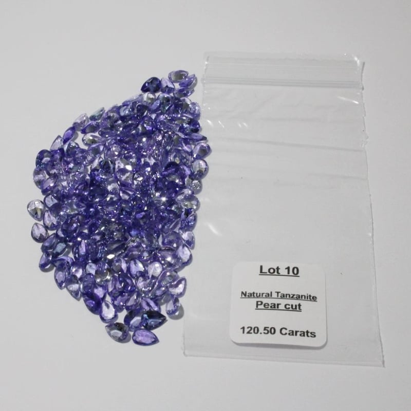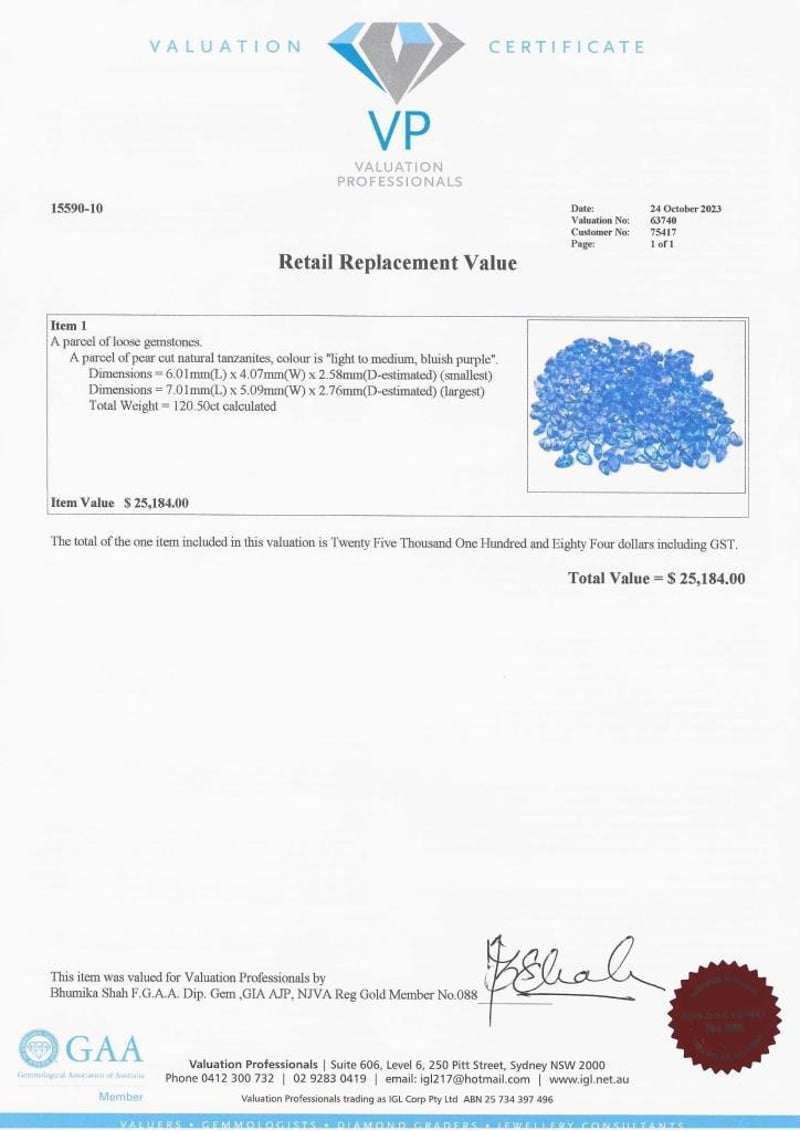 A PARCEL OF PEAR CUT NATURAL TANZANITES A Parcel Of Loose Gemstones. A Parcel Of Pear Cut Natural Tanzanites, Colour Is "Light To Medium, Bluish Purple". Dimensions= 6.0Lmm(L) X 4.07Mm(W) X 2.58Rnm(D-Estimated) (Smallest) Dimensions= 7 0Lmm(L) X 5.09Mm(W) X 2.76Mm(D-Estimated) (Largest) Total Weight= 120.S0Ct Calculated Valuations Provided by an Independent Third-Party Professional Not Directly Associated With Lloyds Auctions at AUD $25184This valuation has been conducted by an independent third-party professional. The valuation amount is an assessment by the issuing valuer and does not reflect the auction value of the item. Any inquiries regarding the valuation should be directed to the issuing valuer (refer to contact details on the certificate), as Lloyds Auctions has no affiliation or influence over the valuation, the valuer, or the stated amount. Condition: Good - Refer Images 0488968+10