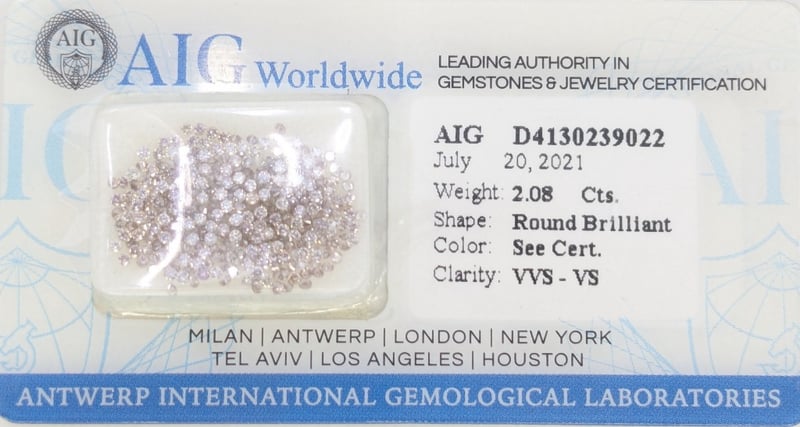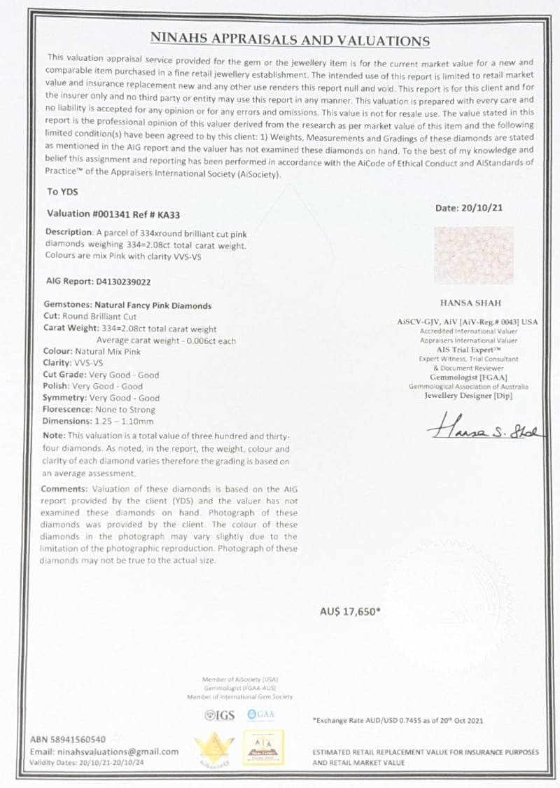 2.08TCW BRILLIANT NATURAL FANCY PINK DIAMONDS 334 Diamonds, 0.006Ct Each Vvs-Vs, Natural Fancy Pink Diamonds Accompanied By Ninahs Valuations Report #001341 And Aig Report D4130239022 Condition: Good - Refer To Images This valuation has been conducted by an independent third-party professional. The valuation amount is an assessment by the issuing valuer and does not reflect the auction value of the item. Any inquiries regarding the valuation should be directed to the issuing valuer (refer to contact details on the certificate), as Lloyds Auctions has no affiliation or influence over the valuation, the valuer, or the stated amount. Insurance Replacement Valuation Amount: $17,650.00 FC 162968+8