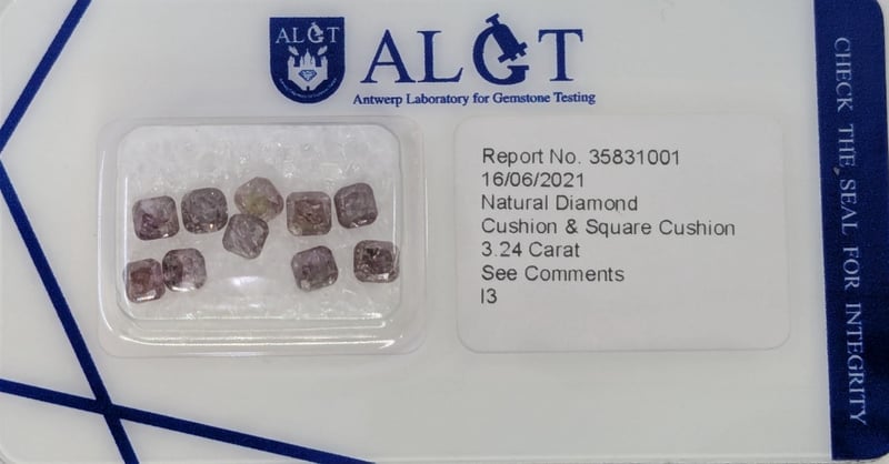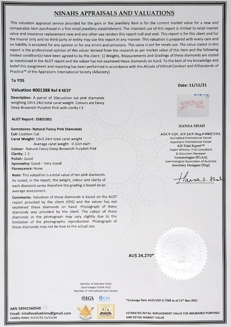 3.24TCW CUSHION NATURAL PINK DIAMONDS 10 Diamonds, 0.32Ct Each I3, Natural Fancy Deep Brownish Purplish Pink Accompanied By Ninahs Valuations Report #001388 And Algt Report No.35831001 Condition: Good - Refer To Images This valuation has been conducted by an independent third-party professional. The valuation amount is an assessment by the issuing valuer and does not reflect the auction value of the item. Any inquiries regarding the valuation should be directed to the issuing valuer (refer to contact details on the certificate), as Lloyds Auctions has no affiliation or influence over the valuation, the valuer, or the stated amount. Insurance Replacement Valuation Amount: $24,270.00 FC 162968+10